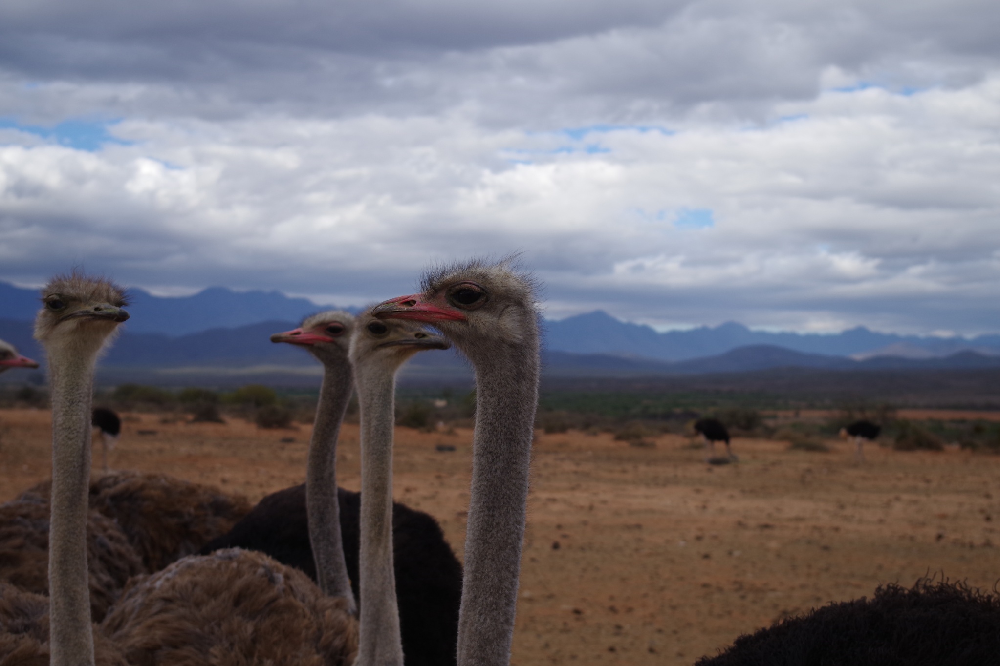Bevor wir den Grill anwerfen, schlendern wir allerdings noch zum Nachbarn auf die Straußenfarm, der mit uns eine kleine private Runde über die Farm dreht. Ernie, ein echter Südafrikaner, betreibt die Farm seit 40 Jahren in 2. Generation und wir fahren stilecht auf der Ladefläche seines Pickups quer durchs Gelände. Kaum sind wir bei den Straußen auf dem Feld, kommen die auch neugierig näher, fast zu nah für mich. Wenn so ein ausgewachsener Strauß nur einen halben Meter weg steht hat man definitiv Respekt! Vor allem die Krallen an den Füßen sind riesig und da will man keinen Tritt abkriegen!