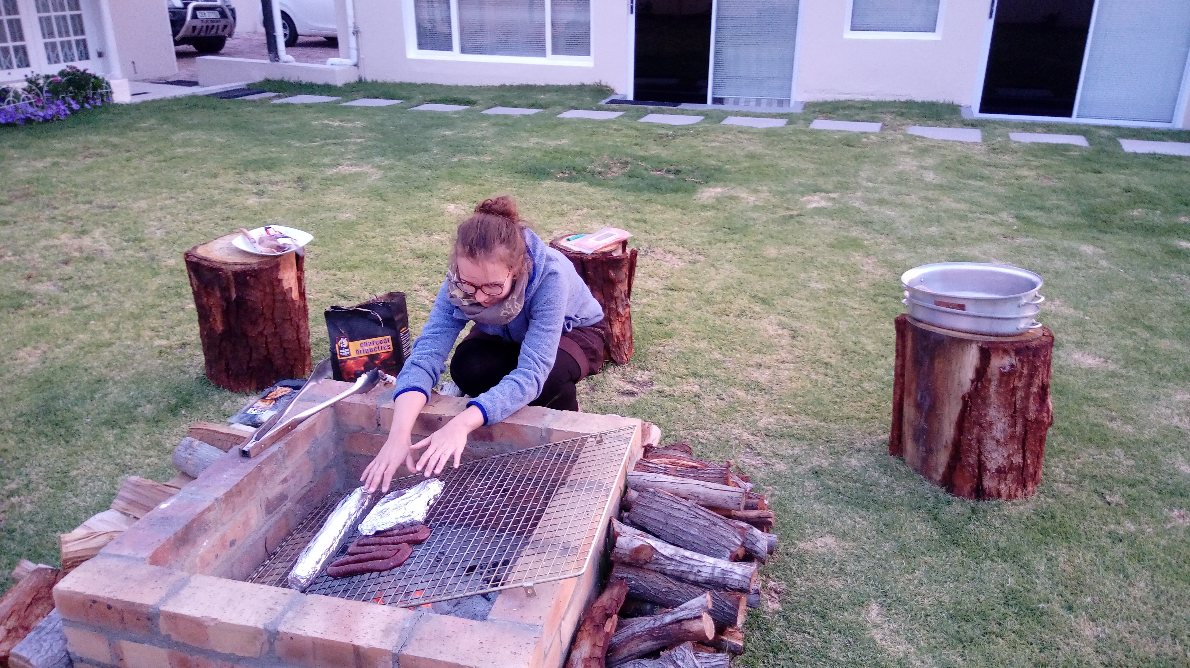 Nach Ankunft nutzen wir erst mal die Möglichkeit eines Braais im Garten (hier wird nicht gegrillt, hier wird gebraait) und grillen Straußenwürste! Leider war der Grill nicht ganz für das bisschen Kohle ausgelegt, die wir brauchen - der Rost war einfach zu weit weg...