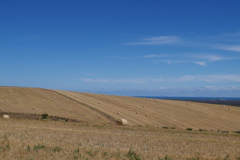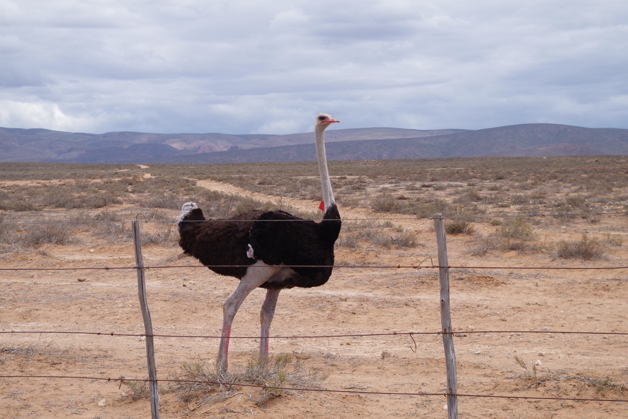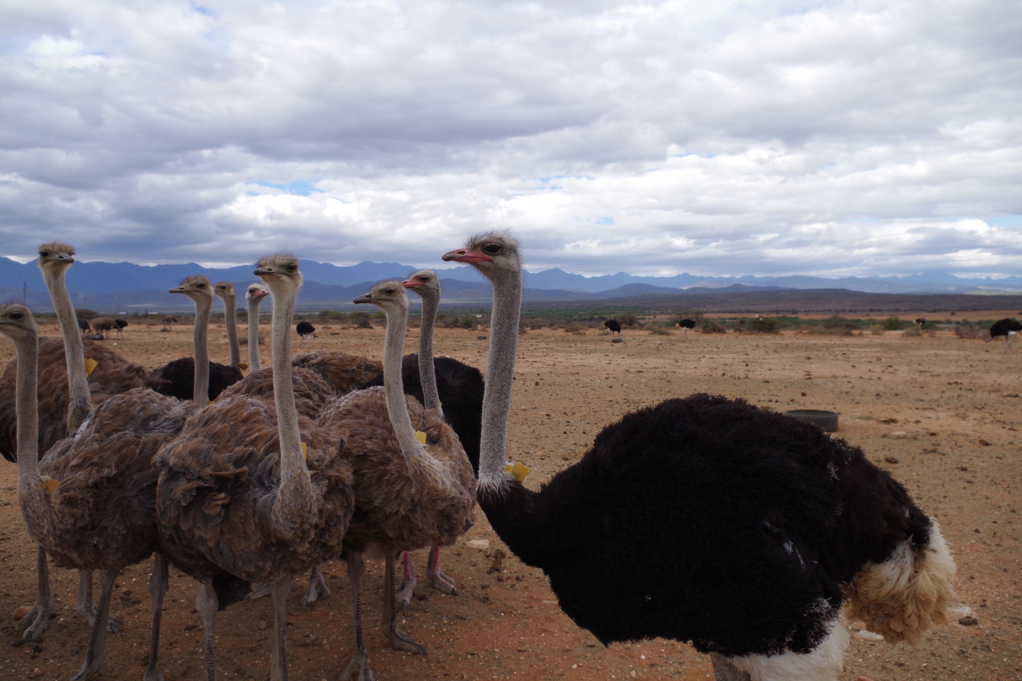 Bevor wir den Grill anwerfen, schlendern wir allerdings noch zum Nachbarn auf die Straußenfarm, der mit uns eine kleine private Runde über die Farm dreht. Ernie, ein echter Südafrikaner, betreibt die Farm seit 40 Jahren in 2. Generation und wir fahren stilecht auf der Ladefläche seines Pickups quer durchs Gelände. Kaum sind wir bei den Straußen auf dem Feld, kommen die auch neugierig näher, fast zu nah für mich. Wenn so ein ausgewachsener Strauß nur einen halben Meter weg steht hat man definitiv Respekt! Vor allem die Krallen an den Füßen sind riesig und da will man keinen Tritt abkriegen!