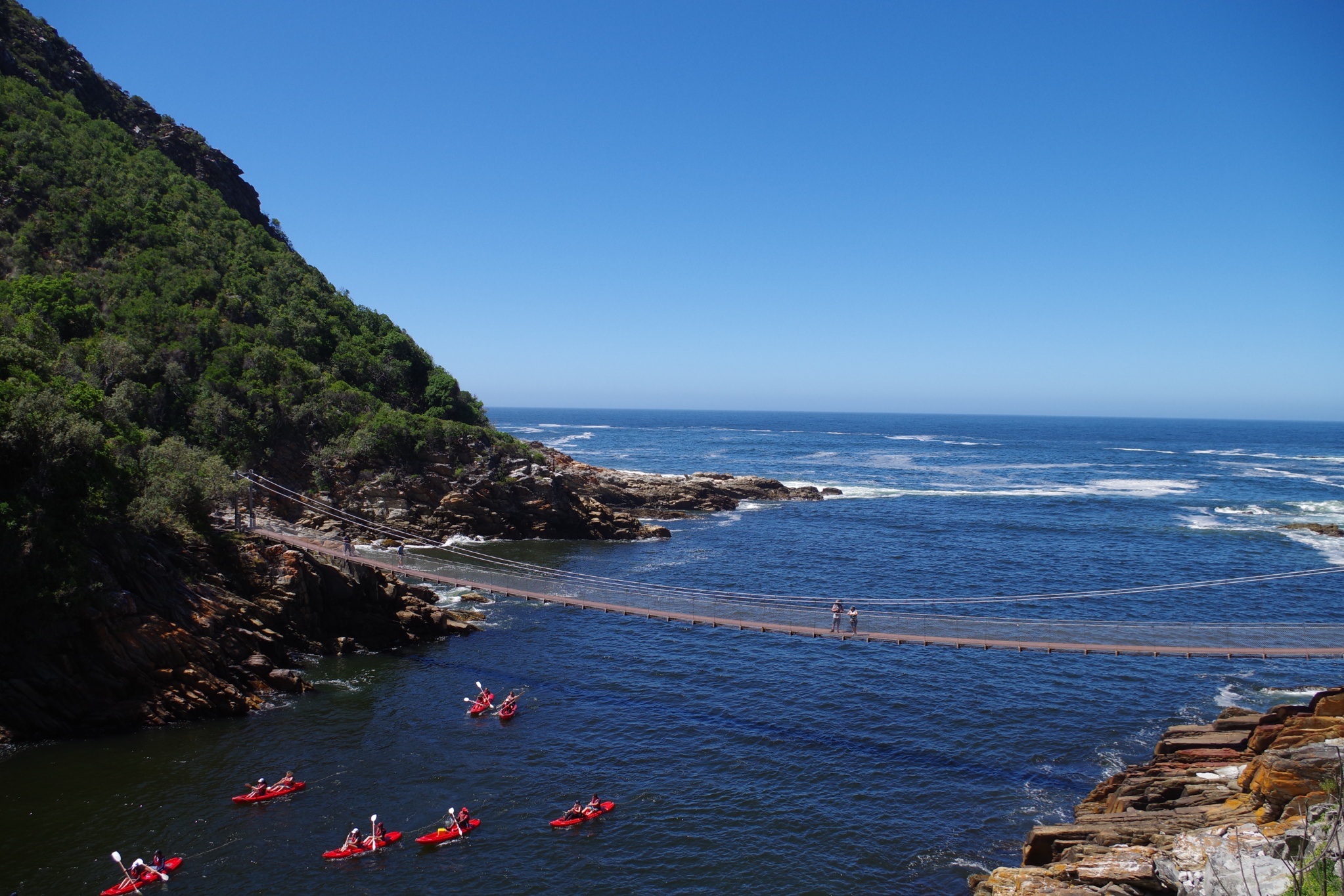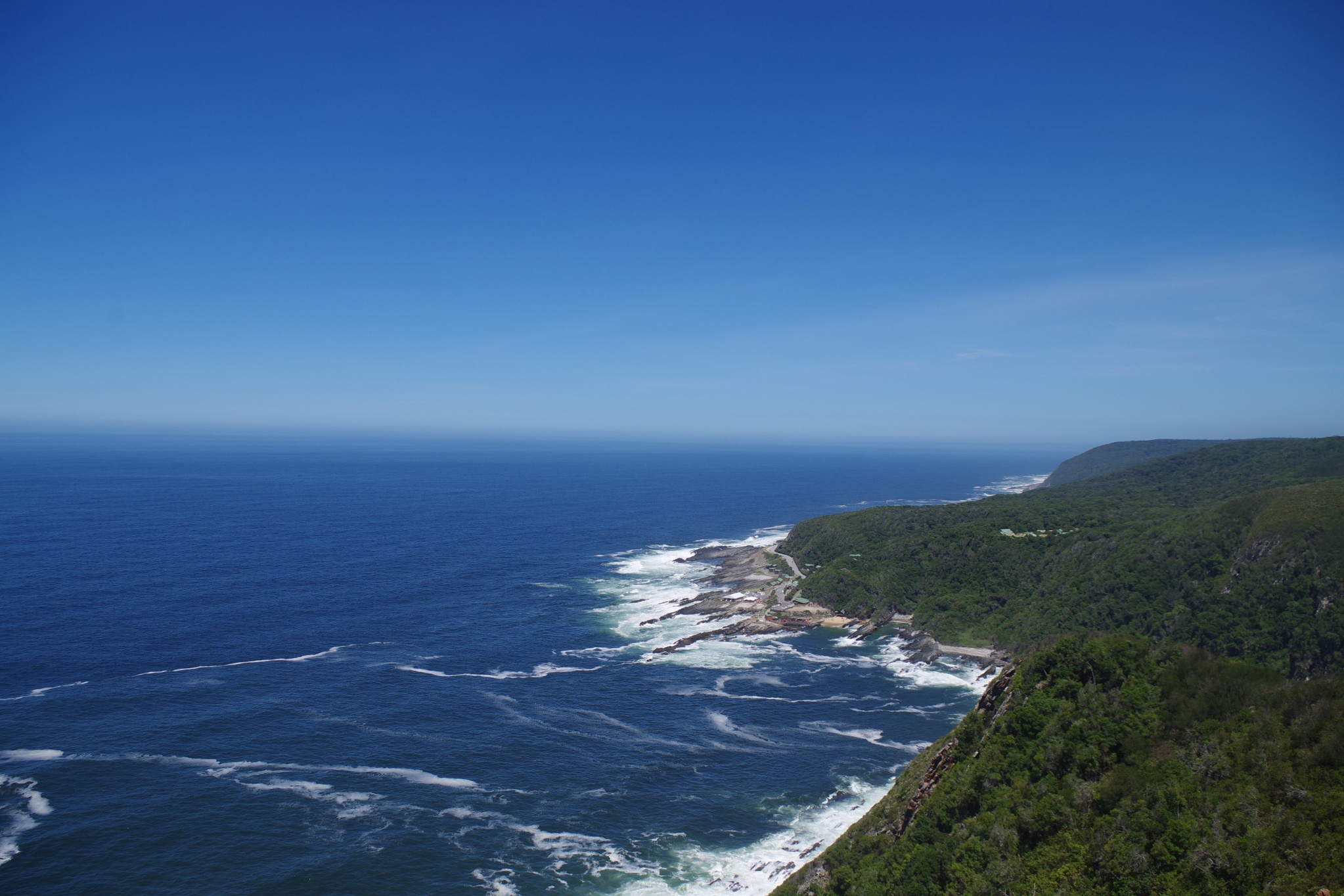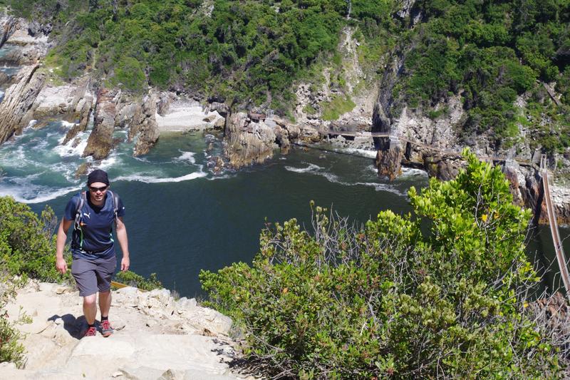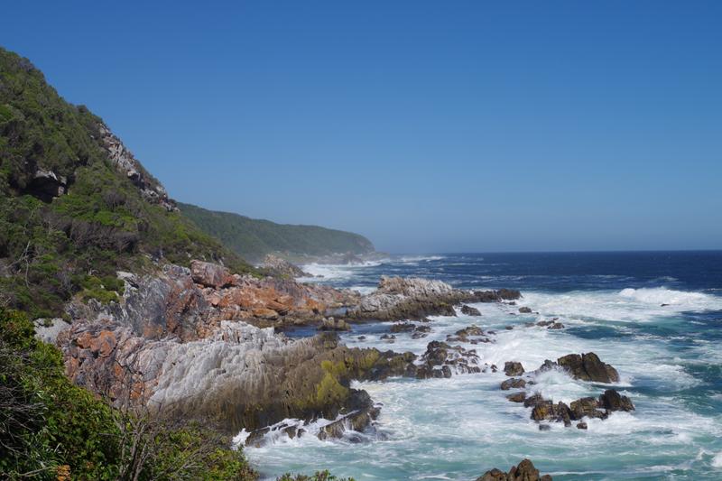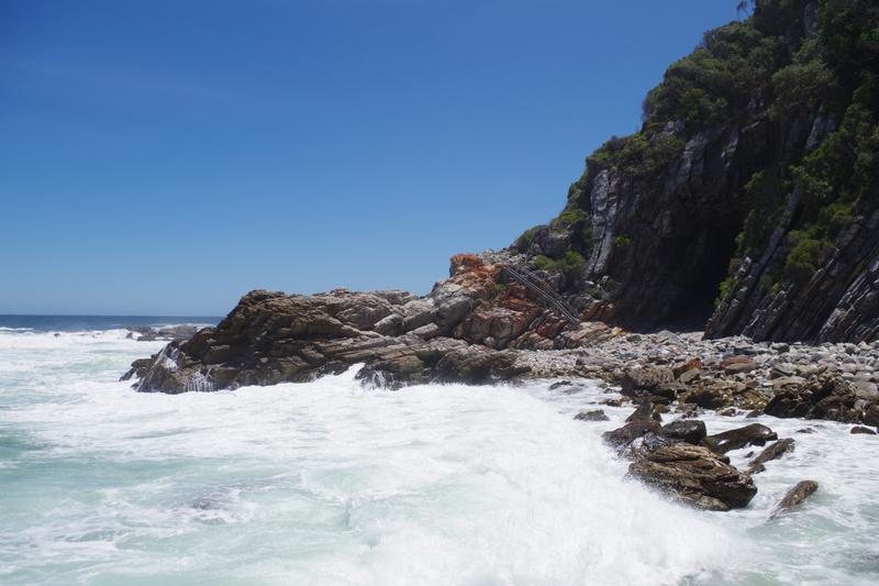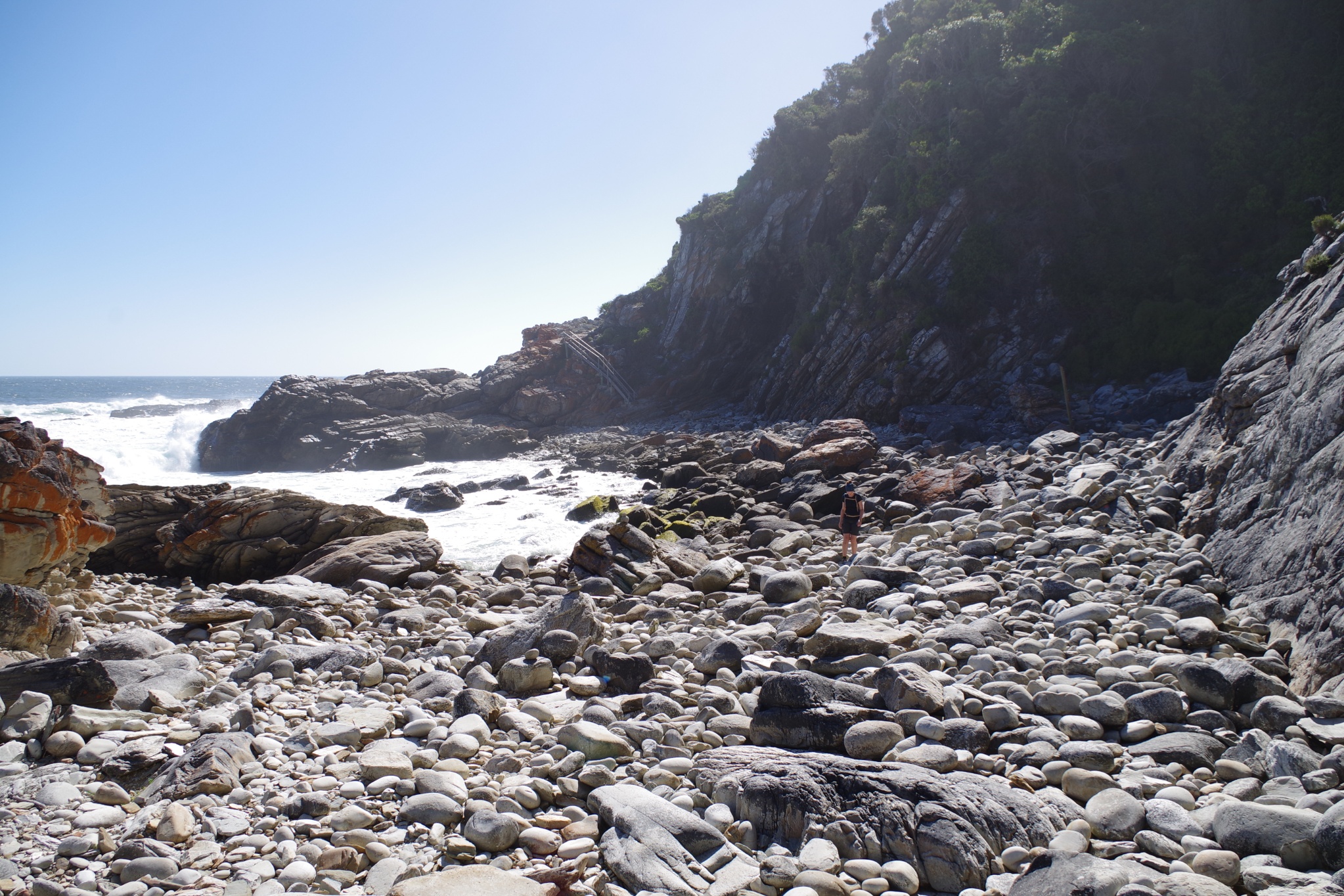 Den Tag nutzen wir um den Tsitsikamma NP zu besuchen und ein Stück vom Otter Trail zu wandern. Wir wollen ca. 3 km von diesem Mehrtagestrek wandern, dürfen aber hinter einem Wassfall nicht weiter, weil wir nur Day Vistors sind und keine Erlaubnis für den gesamten Trail haben (die müsste man so ca. 1 Jahr im voraus beantragen). Zunächst gehen wir aber erstmal in die entgegen gesetzte Richtung zur Mündung des Storms River.