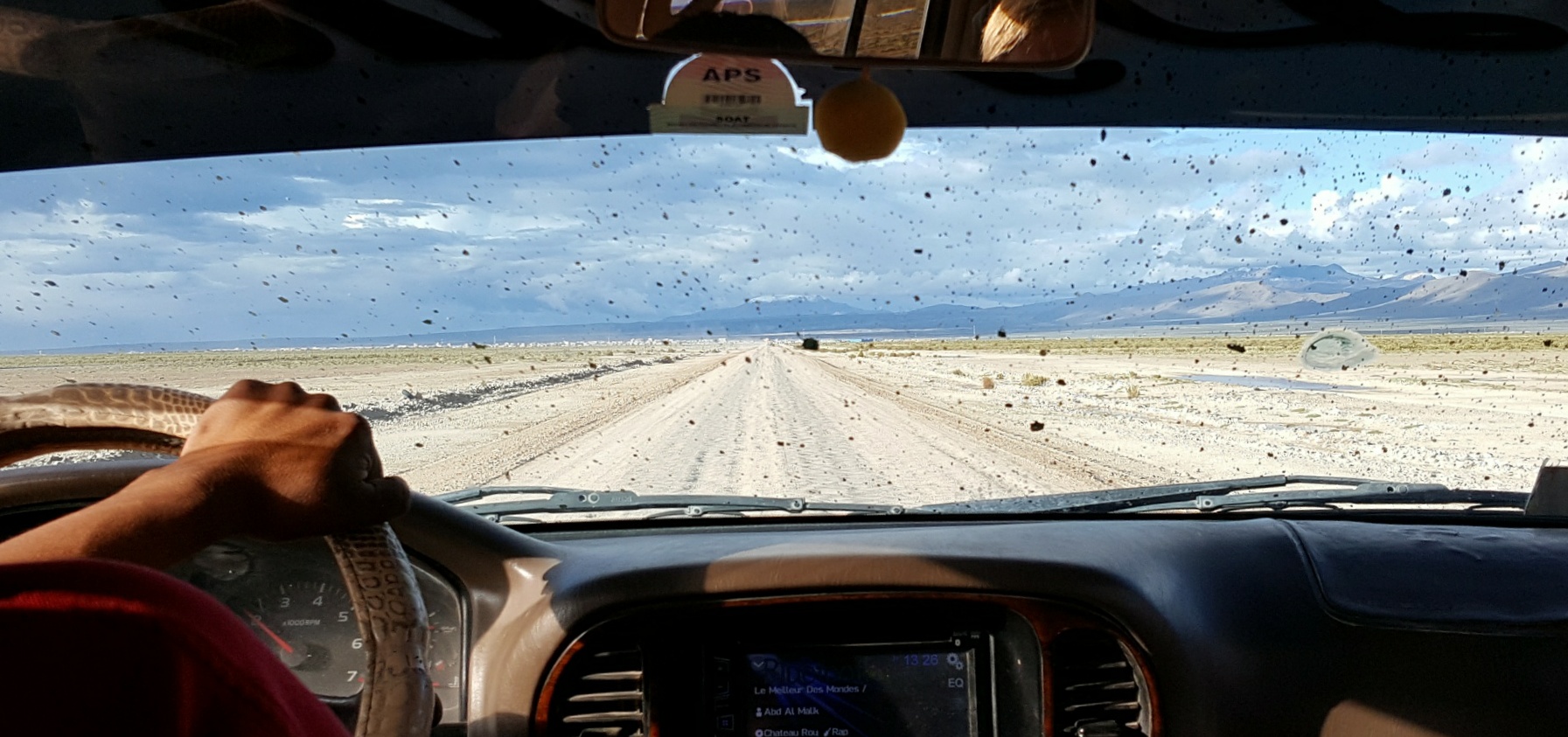 Es geht wieder zurück in die Salzwüste und wie beim ersten Mal kommen wir aus dem Staunen nicht mehr raus. Unserer Fahrer findet die "Staße" quer durch diesen riesigen Wasserspiegel nur per GPS. Die Navigations-App hat er sich gestern noch installiert, also kommt er heute ohne unsere Hilfe zurecht.