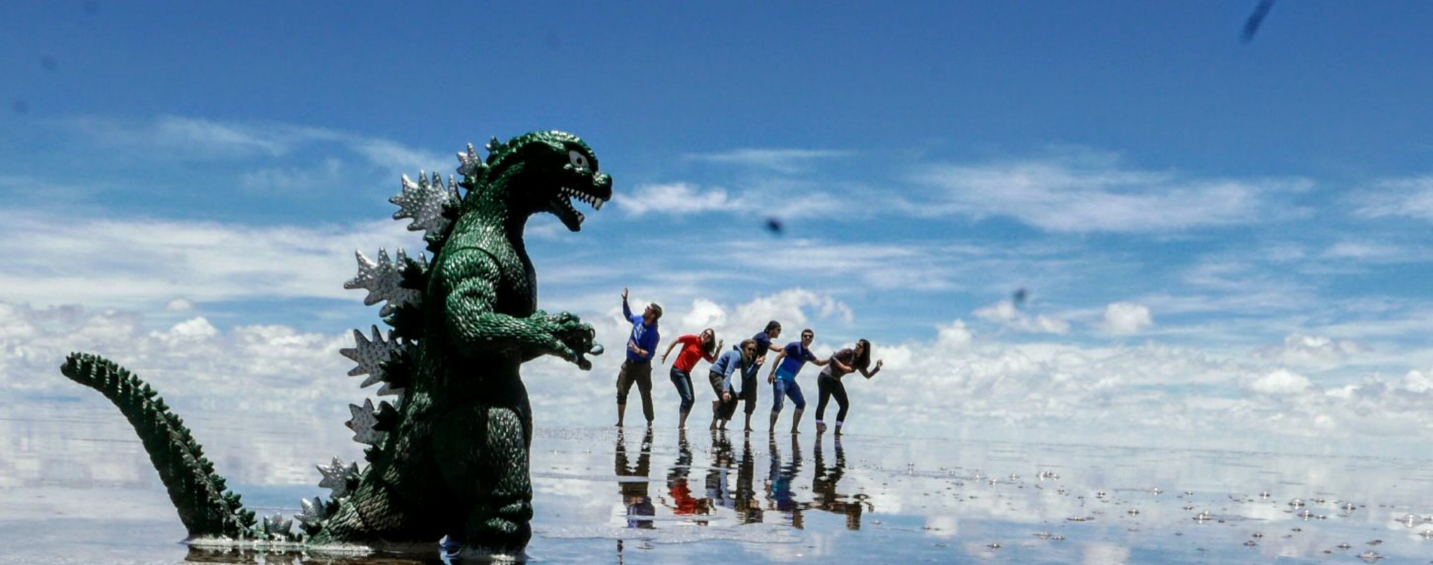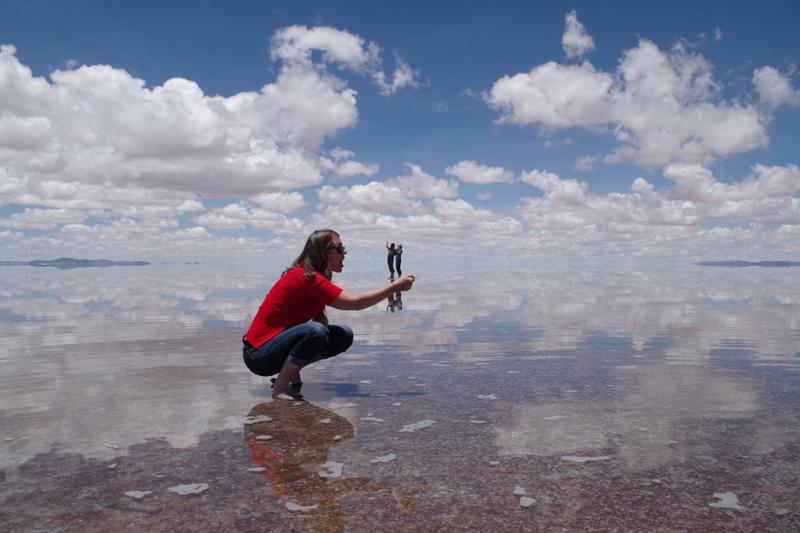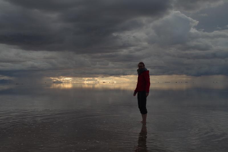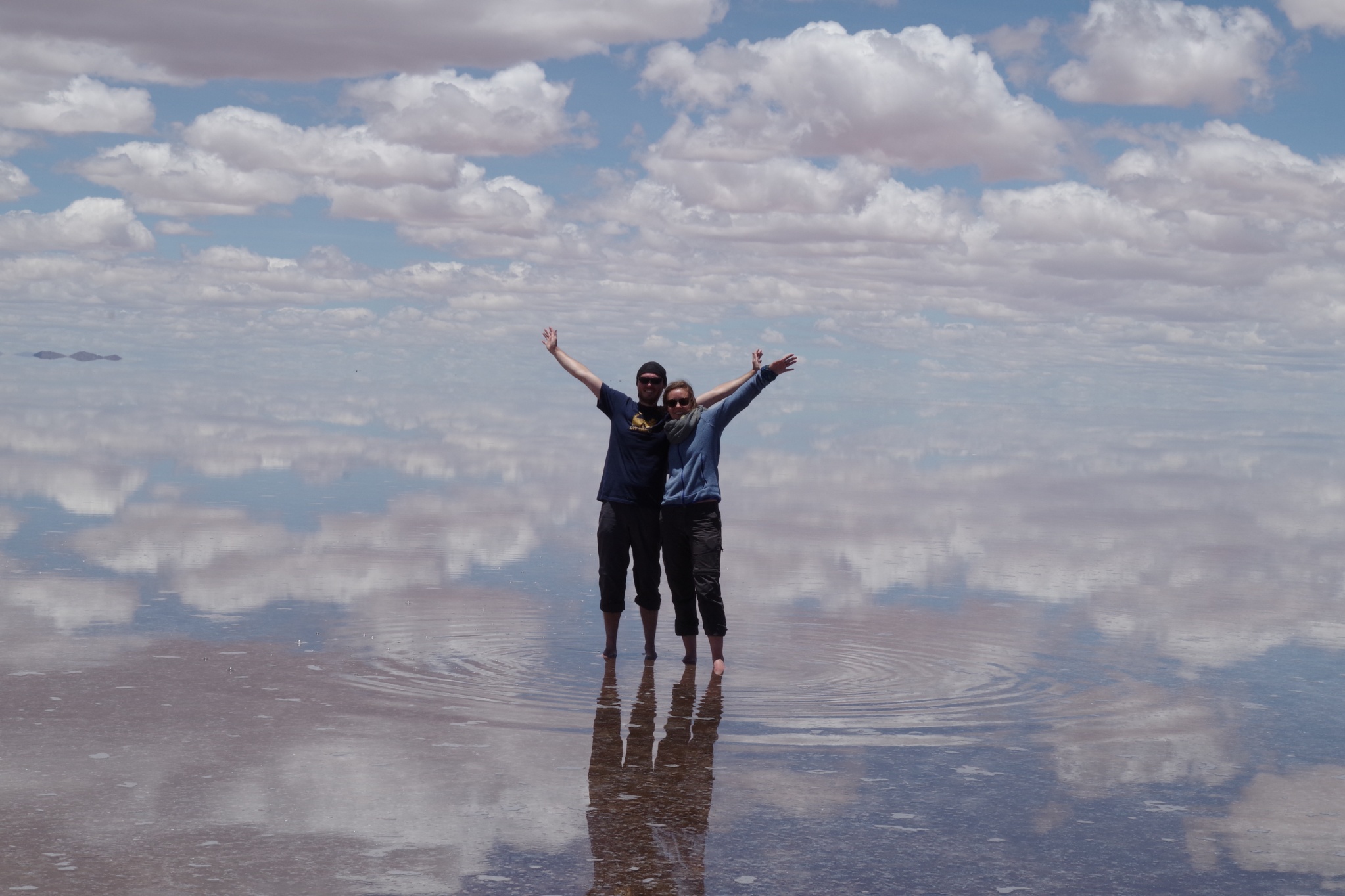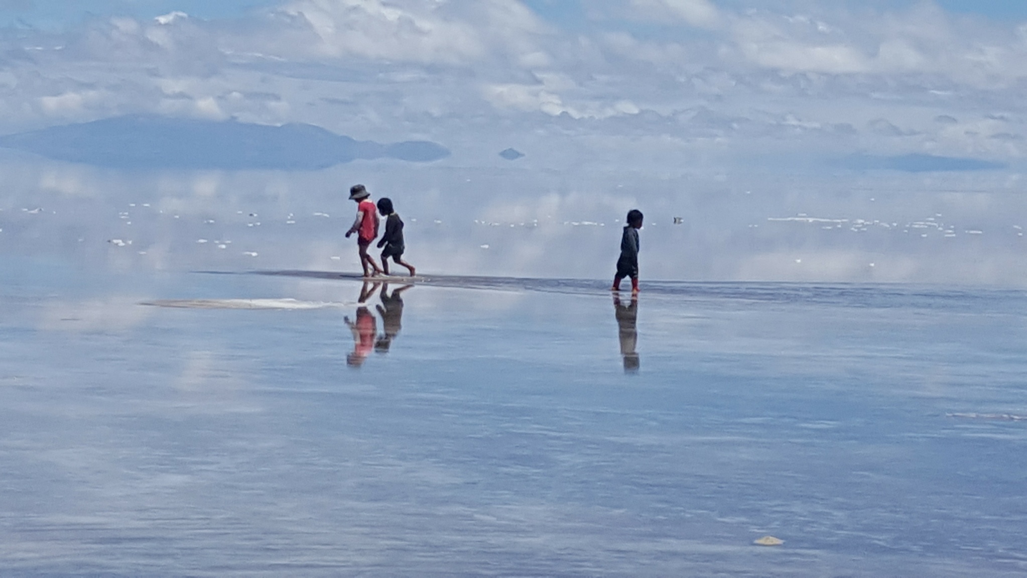 ...mitten im Nichts. Aber unsere Füße erinnern uns schmerzhaft daran, dass wir hier sind, mitten im Salz. Stundenlang durch die Salzlauge über spitze Salzkristalle zu waten tut mit der Zeit ziemlich weh. Auch Sprung-Fotos mit der ganzen Gruppe zu machen war keine wirklich gute Idee, die Landungen waren so schmerzhaft, dass das Unterfangen nichts geworden ist.