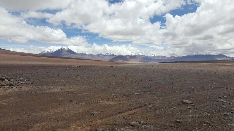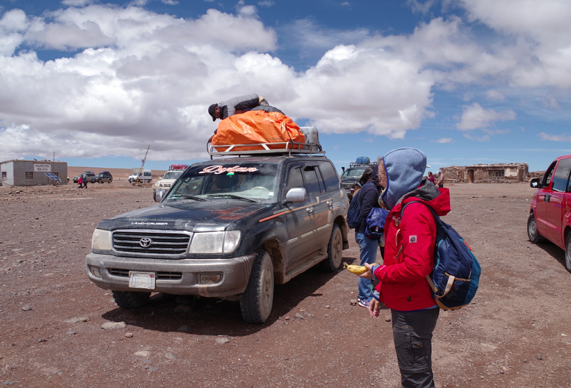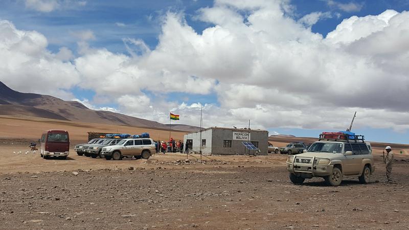 Die letzte Nacht in San Pedro ist kurz, denn um 7:30 Uhr werden wir von unserem Shuttle von unserer Unterkunft abgeholt und einige wenige Meter zur Grenzstation am Ortsrand gefahren. Hier wird erstmal neben unzähligen anderen Bussen und Transportern geparkt. Weiter kommen wir aber vorerst nicht, denn die Grenze ist noch zu. Normalerweise würde die Grenze wohl morgens um 8:00 Uhr öffnen, aber hier beurteilt jeden Tag Jemand aus Santiago de Chile auf Grund von Satellitenbildern (oder vielleicht würfelt er auch), zu welcher Uhrzeit die Grenze öffnen darf. Heute müssen wir in der immer weiter steigenden Sonne bis 11 Uhr warten bevor wir ausreisen dürfen. Unsere Tourleiter sind vorbereitet und bauen im Schatten unseres Transporters einen kleinen Tisch mit Frühstück auf. So haben wir genug Zeit unsere Mitfahrer für die nächsten Tage kennen zu lernen - ein französisch/rumänisches und ein brasilianisches Pärchen - Sympathische Runde.