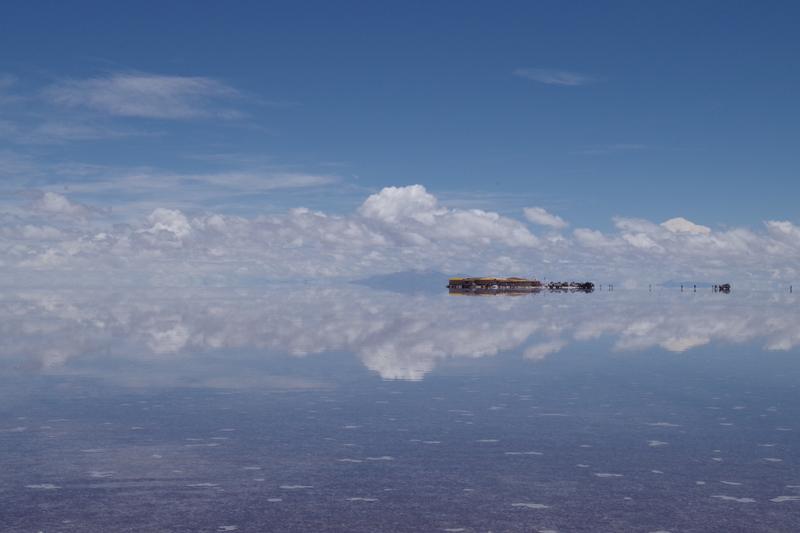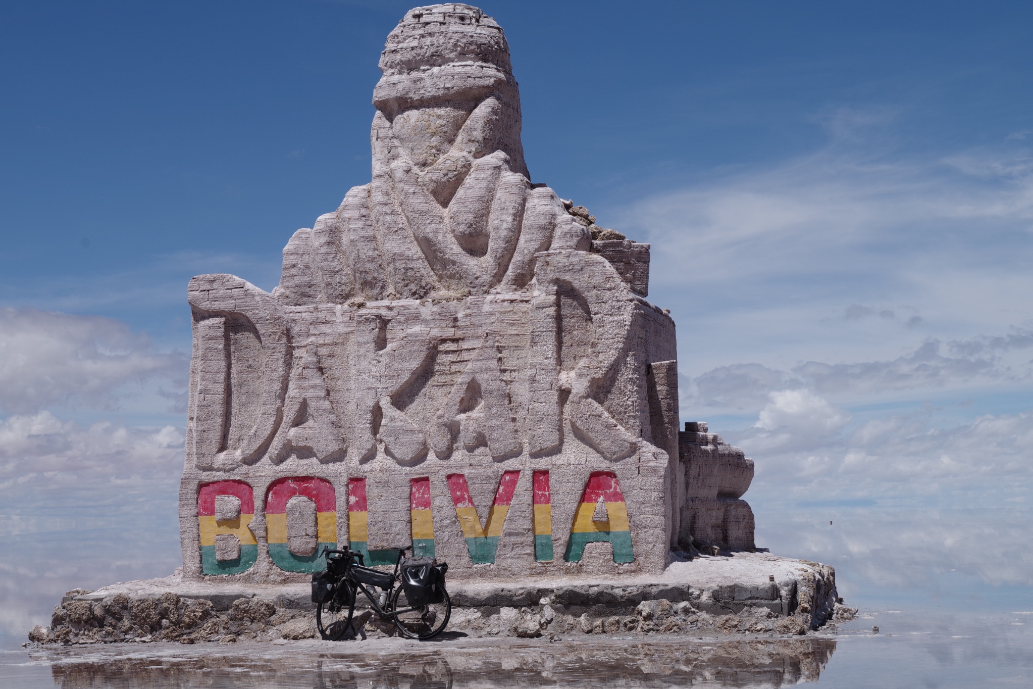 Der Weg führt uns im Schritttempo mitten in dieses spiegelblanke Nichts hinein, kilometerweit mitten in die Salzwüste. Hier steht ein Denkmal aus Salz für die Rallye Dakar, die hier teilweise durchführt.