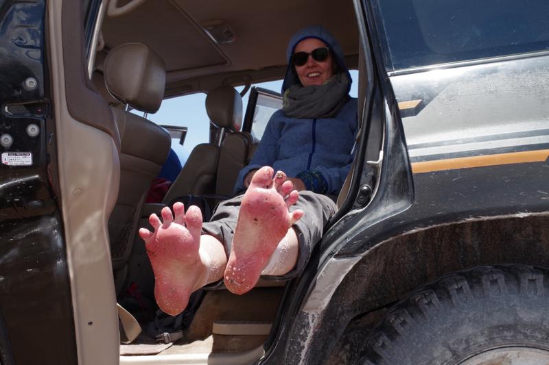 Aber selbst das Video, wie auch die folgenden Bilder können den wahren Eindruck nur schlecht vermitteln. Der Moment, in dem wir anhalten und barfuß ins Wasser laufen ist unbeschreiblich. Das Wasser ist lauwarm, der Boden steinhart und jeder Wassertropfen auf den Beinen oder der Hose bildet binnen Sekunden Salzflecken. Jeder Schritt hinterlässt einen Abdruck, da das angelöste Salz weggtragen wird. Nach einiger Zeit wird das Gehen über den scharfen Boden allerdings zur Qual für die Füße und das Salz macht die Sache auch nicht angenehmer.