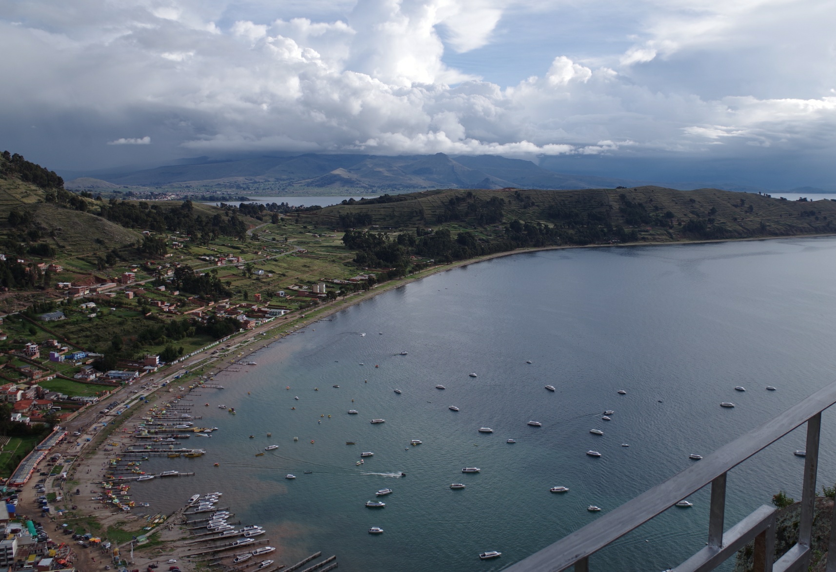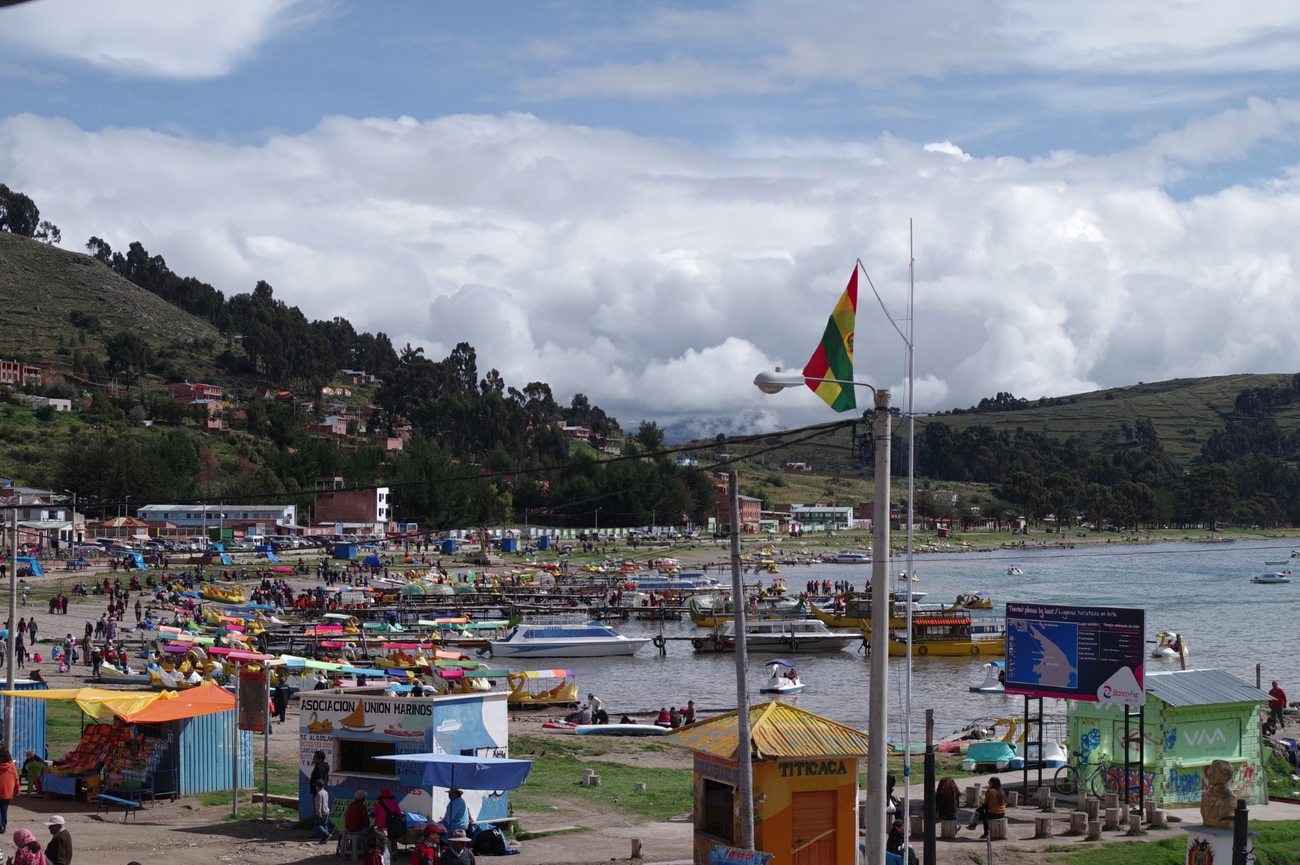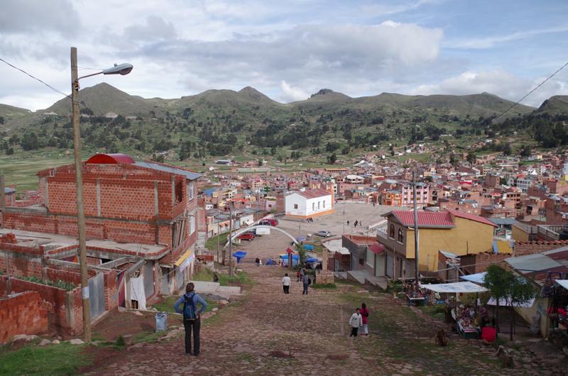 Der Ort ist touristischer, als wir gedacht hätten, da er der Startpunkt für sämtliche Ausflüge auf der bolivianischen Seite des Titicaca-Sees ist. Aber die Tretschwäne und Jet-Skis, die in der Bucht umher fahren, geschweige denn die Leute, die in aufblasbaren Bällen über's Wasser "laufen", wollen nicht so ganz ins Bild passen.