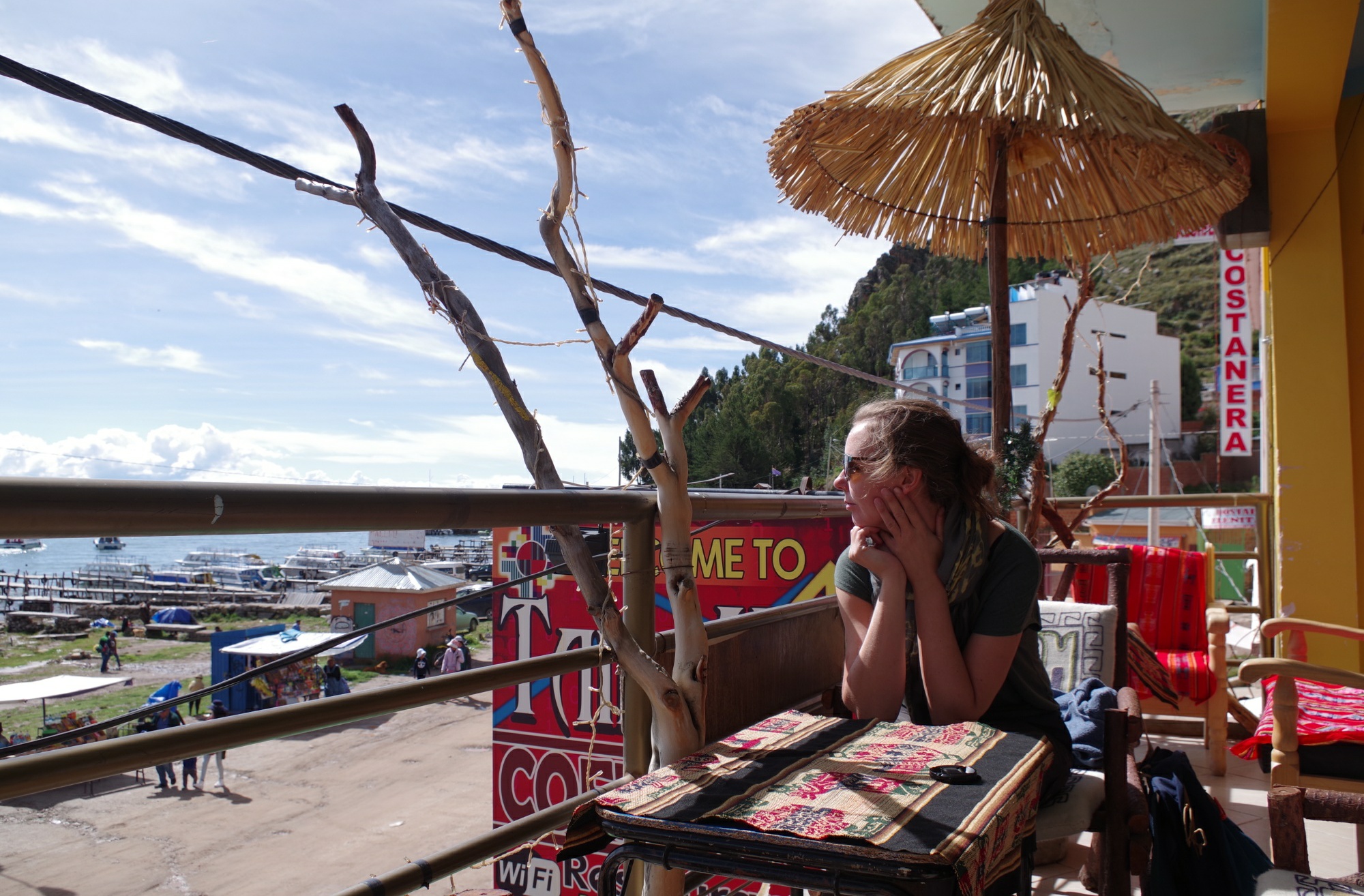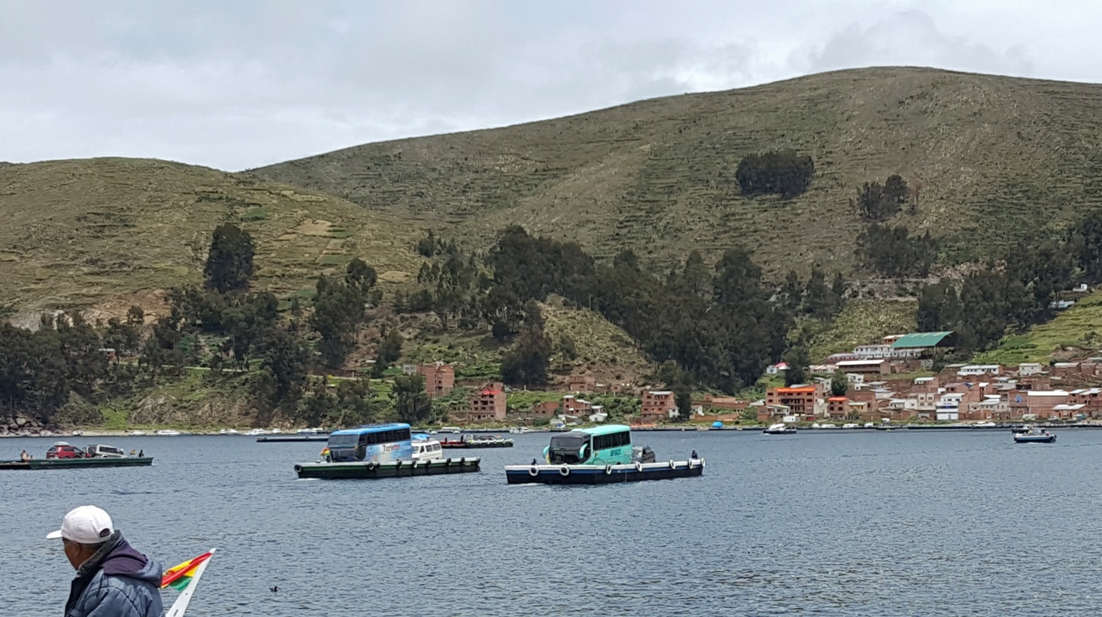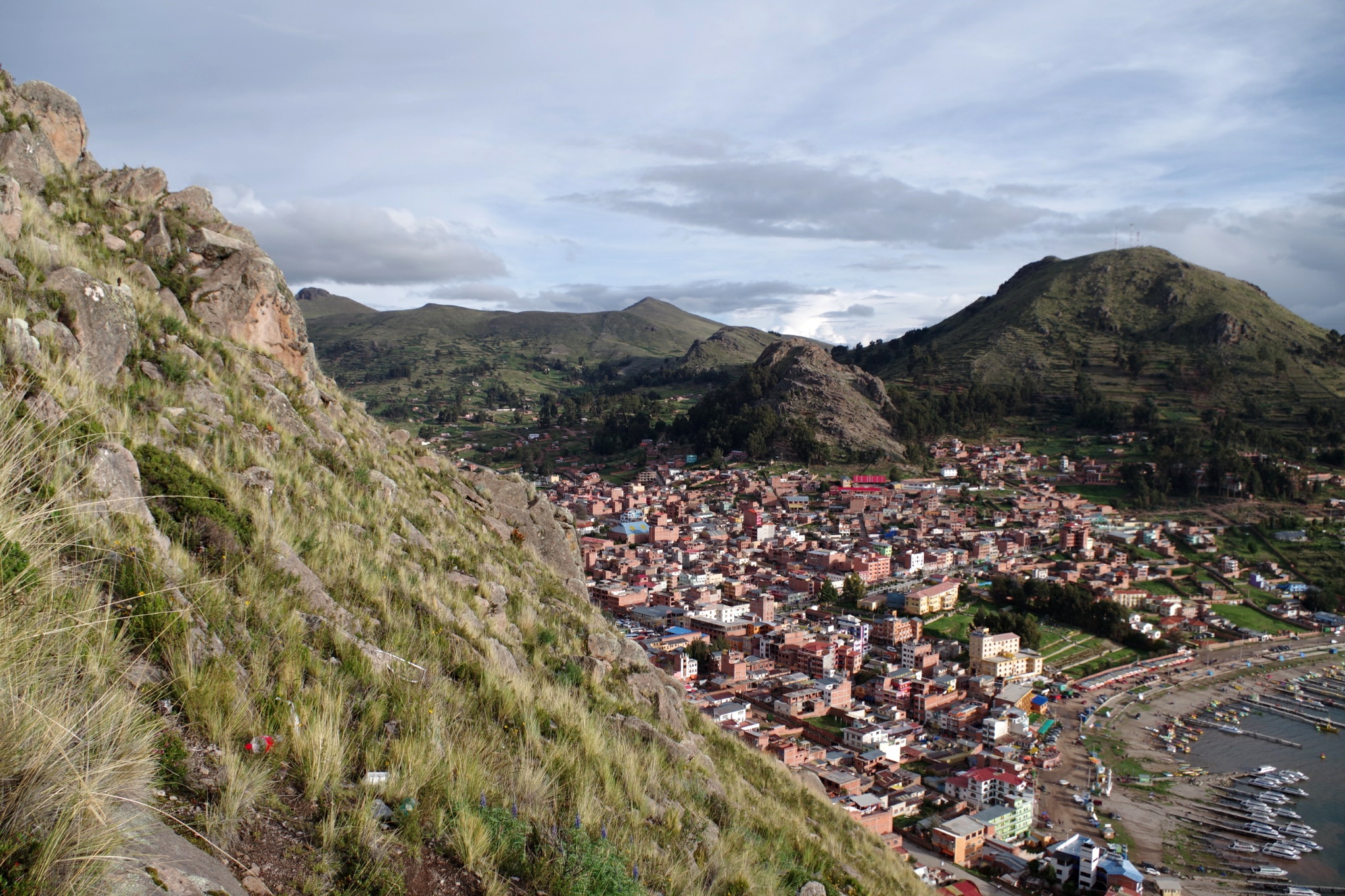 Der Ort ist touristischer, als wir gedacht hätten, da er der Startpunkt für sämtliche Ausflüge auf der bolivianischen Seite des Titicaca-Sees ist. Aber die Tretschwäne und Jet-Skis, die in der Bucht umher fahren, geschweige denn die Leute, die in aufblasbaren Bällen über's Wasser "laufen", wollen nicht so ganz ins Bild passen.