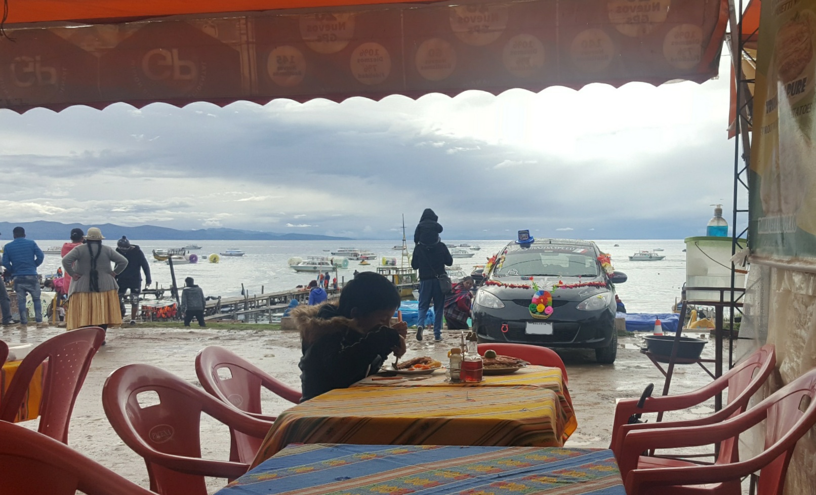 Mittlerweile sind wir wieder etwas mutiger (oder besser angepasst), was das Essen in Bolivien angeht und "wagen" uns an einen der vielen Straßenstände, die sich entlang des Strandes aneinander reihen.