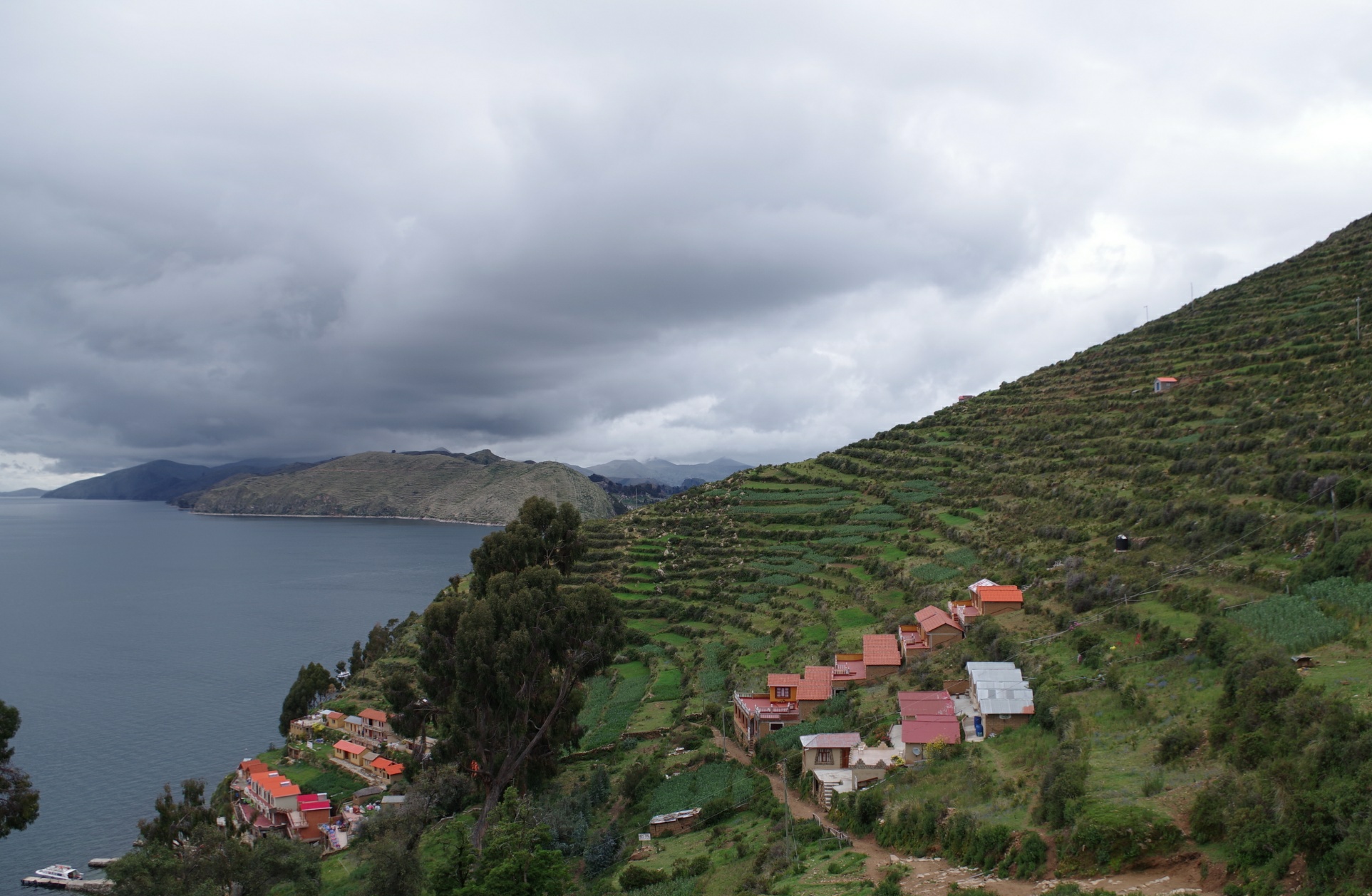 Damit ist das Thema Zelten auf der Isla del Sol für uns erledigt und wir entscheiden uns dafür noch ein Boot zurück nach Copacabana zu nehmen. Kurz danach sind wir also wieder an den Landungsstegen. Eigentlich wollten wir erst um 16 Uhr ein Boot zurück nehmen, aber scheinbar sind die Boote noch nicht voll und wir werden überredet jetzt gleich mitzukommen. Und warum auch eine Stunde hier rum sitzen? Leider ist das Boot, auf dem wir als Letzte landen eigentlich schon voll. Also klettere ich auf den letzten freien Platz auf dem Dach, während Pia sich auf eine Bank neben den Motor quetscht und die nächsten 2 Stunden von Abgasen beräuchert wird. Auf dem Dach kämpfen wir nach der Hälfte der Fahrt mit unangenehmem Wind und Regen und versuchen uns so gut es geht unter unseren Schwimmwesten zu verstecken.