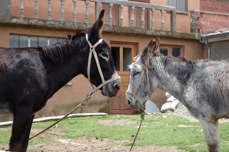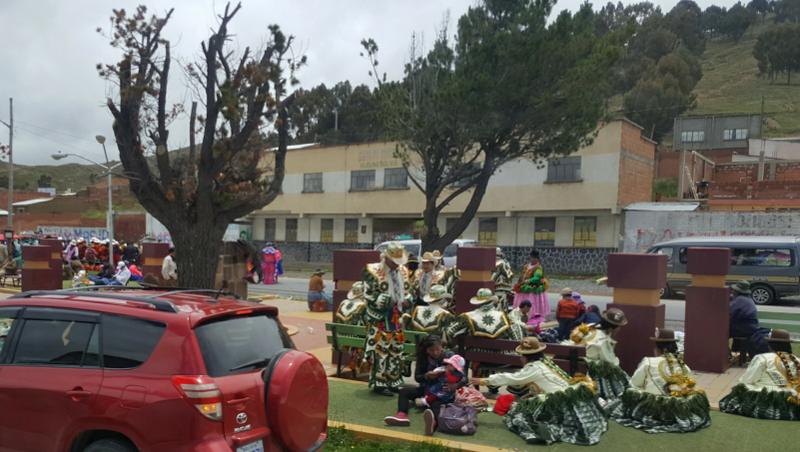 Leider ist die Busfahrt nicht allzu angenehm, da wir uns in die letzte Sitzreihe quetschen müssen und auch die Federung bzw. der Zustand der Straßen lassen uns unterwegs immer mal wieder vom Sitz abheben. Nachdem wir es aus der Stadt raus geschafft haben, fahren wir einige Zeit weiter auf knapp 4000 m Höhe durch die Landschaft Boliviens, die hier nur wenig Abwechslung bietet. Zumindest bis wir durch einige kleine Dörfer fahren, ...