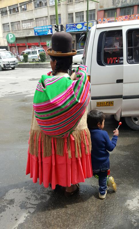 Die Krönung des Ganzen bzw. des Hauptes stellt ein Hut dar, der regional unterschiedlich ausfällt. Richtung chilenischer Grenze haben wir oft breitkrempige Hüte gesehen, ähnlich Cowboyhüten. Im Landesinneren Richtung La Paz sind eher Bowlerhüte in Mode.