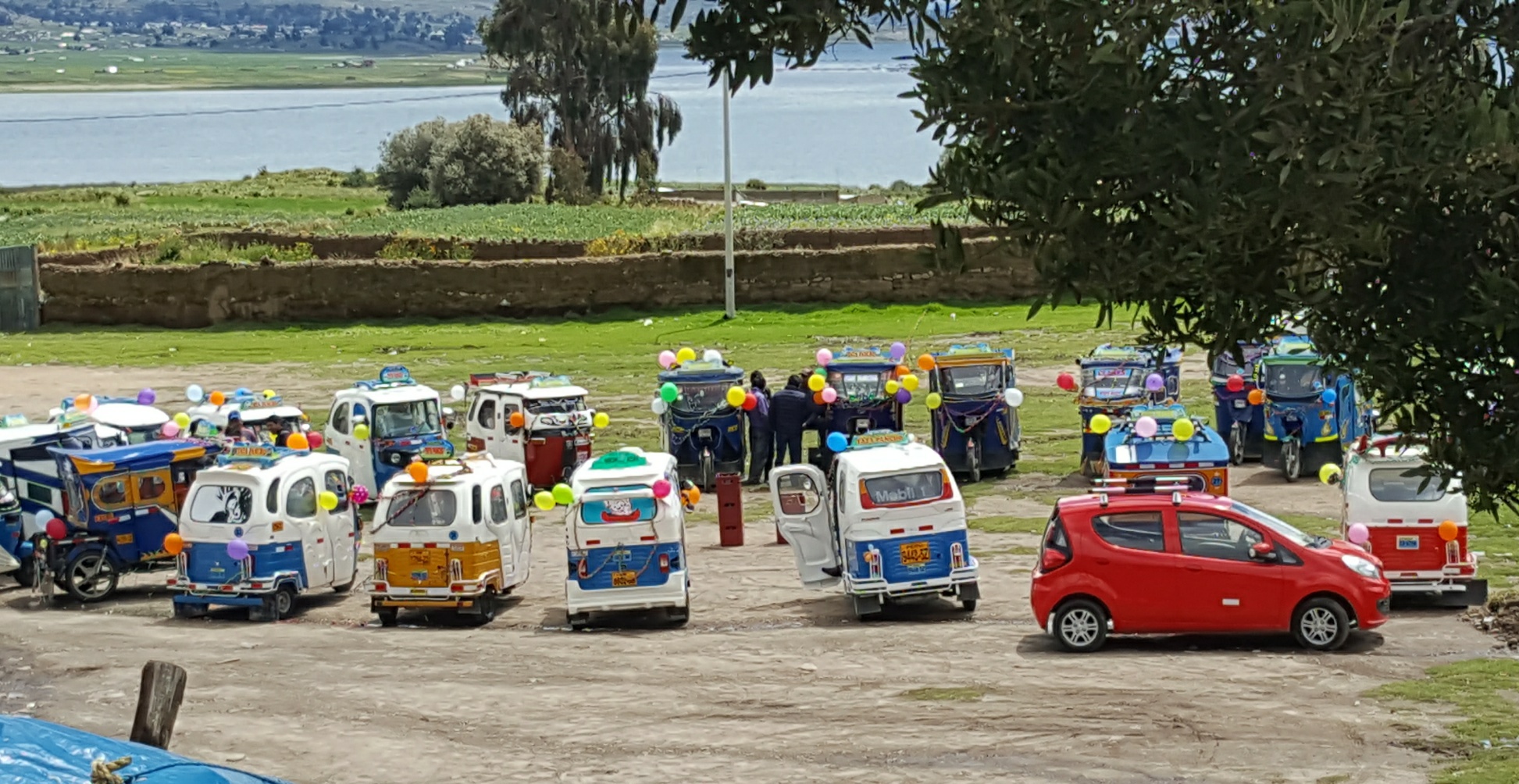 Direkt an der Grenze stehen mehrere Tuktuks, die für den Karneval geschmückt sind und uns gerne mitnehmen würden. Witzig anzusehen, diese kleinen Dreirad-Autos, die gab es in Bolivien nicht und hier steht gleich ein ganzer Haufen von ihnen rum.