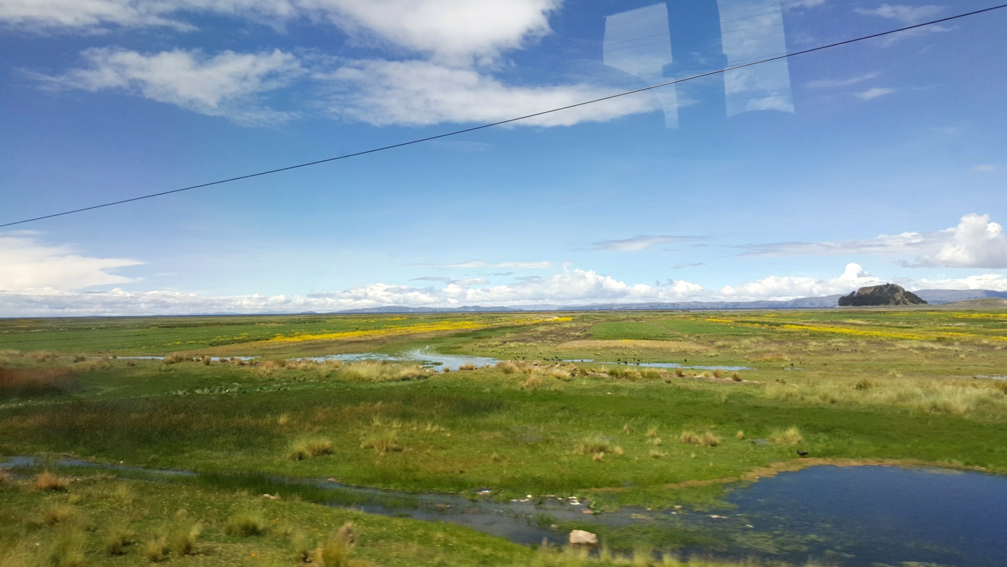 Wir würden eigentlich gerne noch ein wenig die Sonne genießen, aber unser Busfahrer hupt schon ungeduldig, dass wir einsteigen sollen. Jetzt geht es rund um den Titicaca-See Richtung Puno. Wir passieren viele kleine Siedlungen am Ufer, meist Lehmhütten oder die uns bereits bekannten unfertigen Bauten aus unverputzten Ziegelsteinen. Frauen sitzen in ihren traditionellen Kleidern mitten in der Wiese und hüten Schafe, Fischreusen stehen am Ufer und im Wasser....