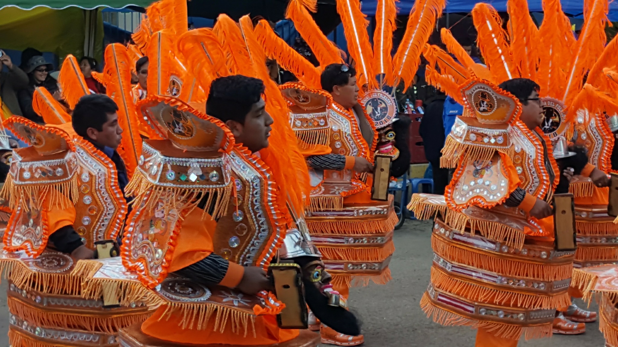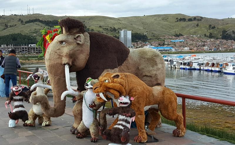 An der Uferpromenade laufen wir geradewegs in die letzten Gruppen des Karnevalsumzuges, schließlich ist heute Faschingsdienstag. Die Tribünen sind schon halbleer, die Leute merklich angetrunken, mehrere Herren (versuchen) sich neben dem Gehweg in den See zu erleichtern und die letzten kostümierten Truppen ziehen durch. Wir schlängeln uns unter und zwischen den Tribünen durch und können noch ein paar Blicke auf den peruanischen Karneval erhaschen.