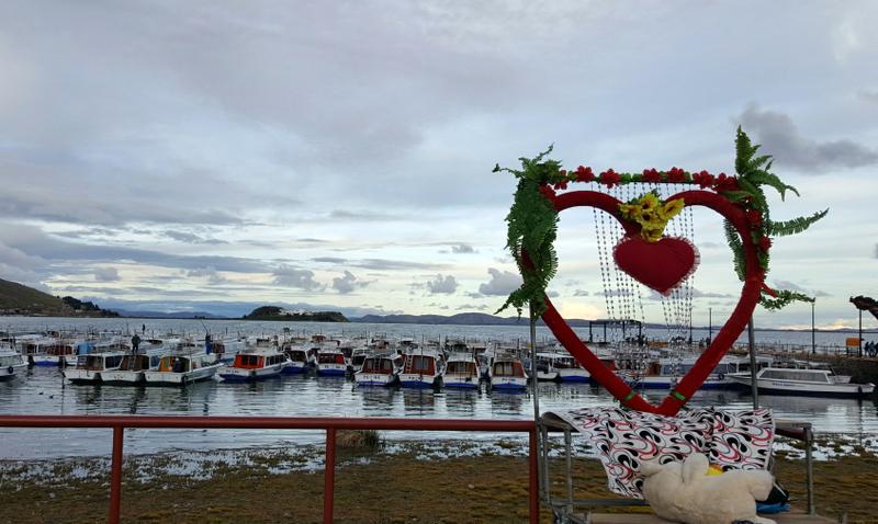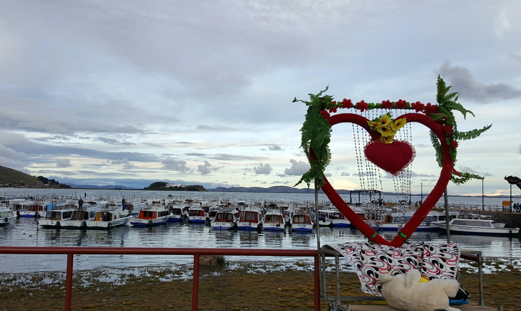 Auf der Suche nach etwas Essbarem zieht es uns zum alten Landungssteg, von dem auch die Touristenboote zu den schwimmenden Inseln der Uros fahren. Die Aussicht auf den riesigen See, der eher wie ein Meer wirkt, ist wunderschön,....