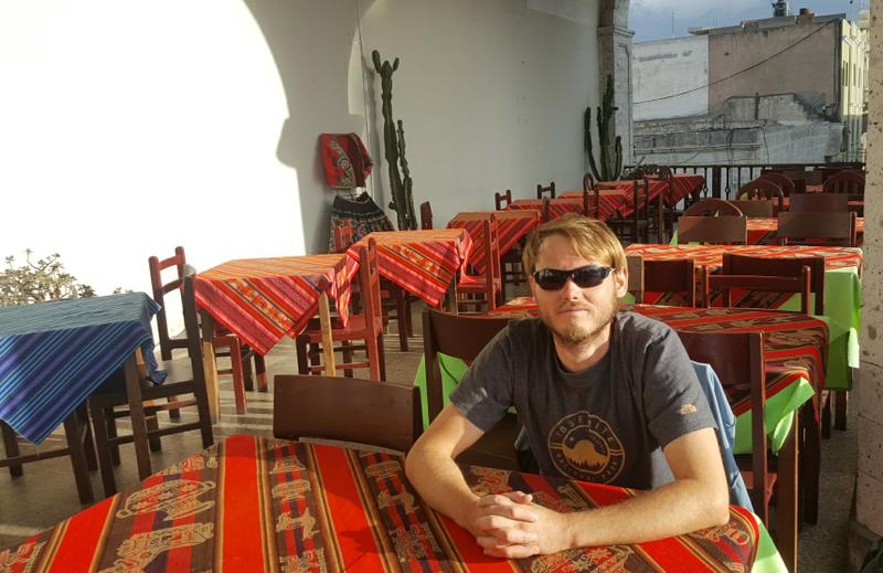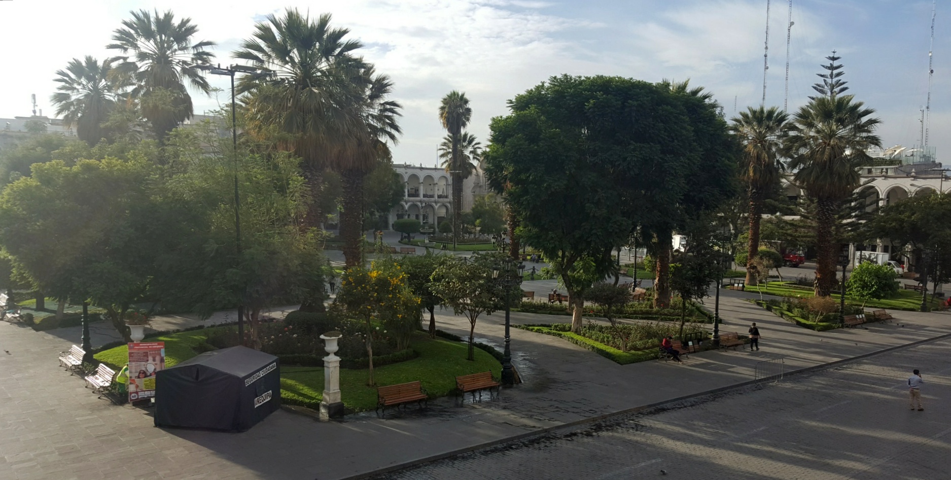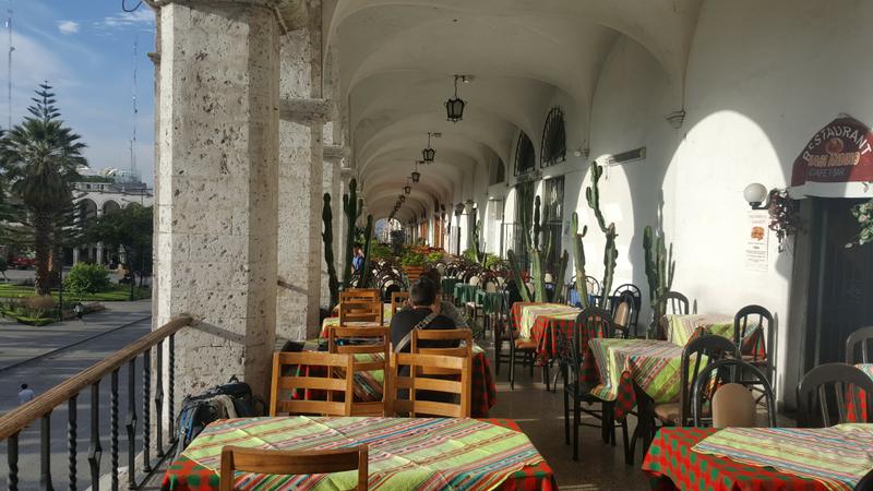 Es ist immer noch früh und wir beschließen die Aussicht auf den noch menschenleeren Plaza de Armas beim Frühstück zu genießen.