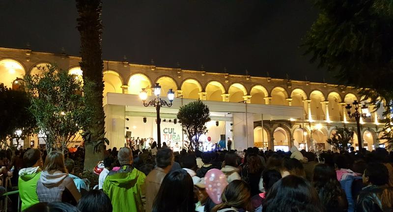 Auf dem Rückweg zum Hostel auf dem Plaza de Armas kommen wir an einer Bühne vorbei, um die sich mittleweile viele Menschen drängen. Vorhin war hier noch nicht viel los und am Morgen hatten wir eigentlich gedacht, die Leute bauen ab und nicht auf. Es ist der 14.02. und Valentinstag, der hier augenscheinlich groß celebriert wird.