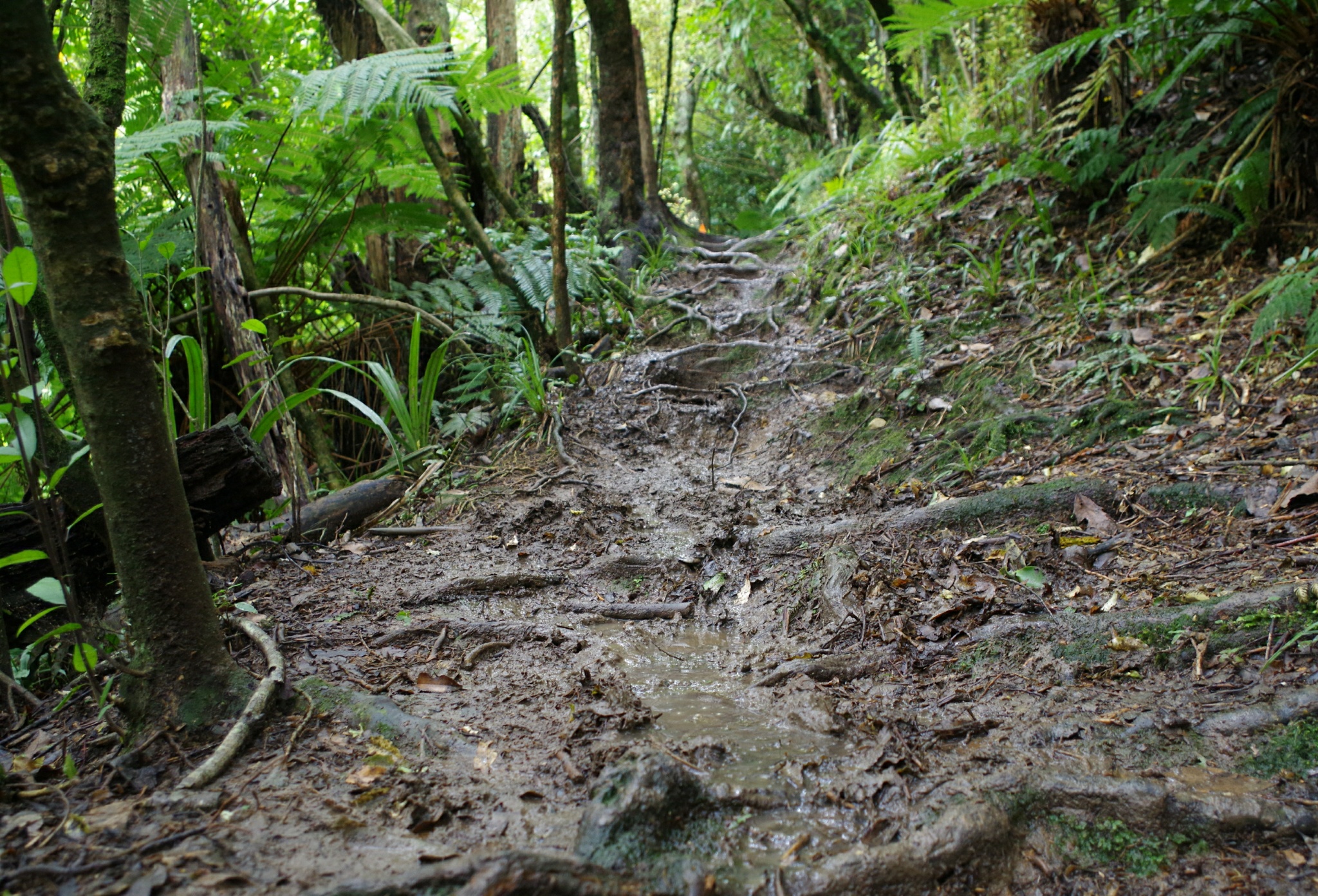 Uns kommt eine Schulklasse entgegen und die Lehrer wünschen uns viel Glück und meinen, dass sie uns schön viel Matsch hinterlassen hätten. Durch die Spuren von zig Leuten durch den Matsch, ist der nasse Weg teilweise ganz schön rutschig und bietet auch andere Hindernisse.