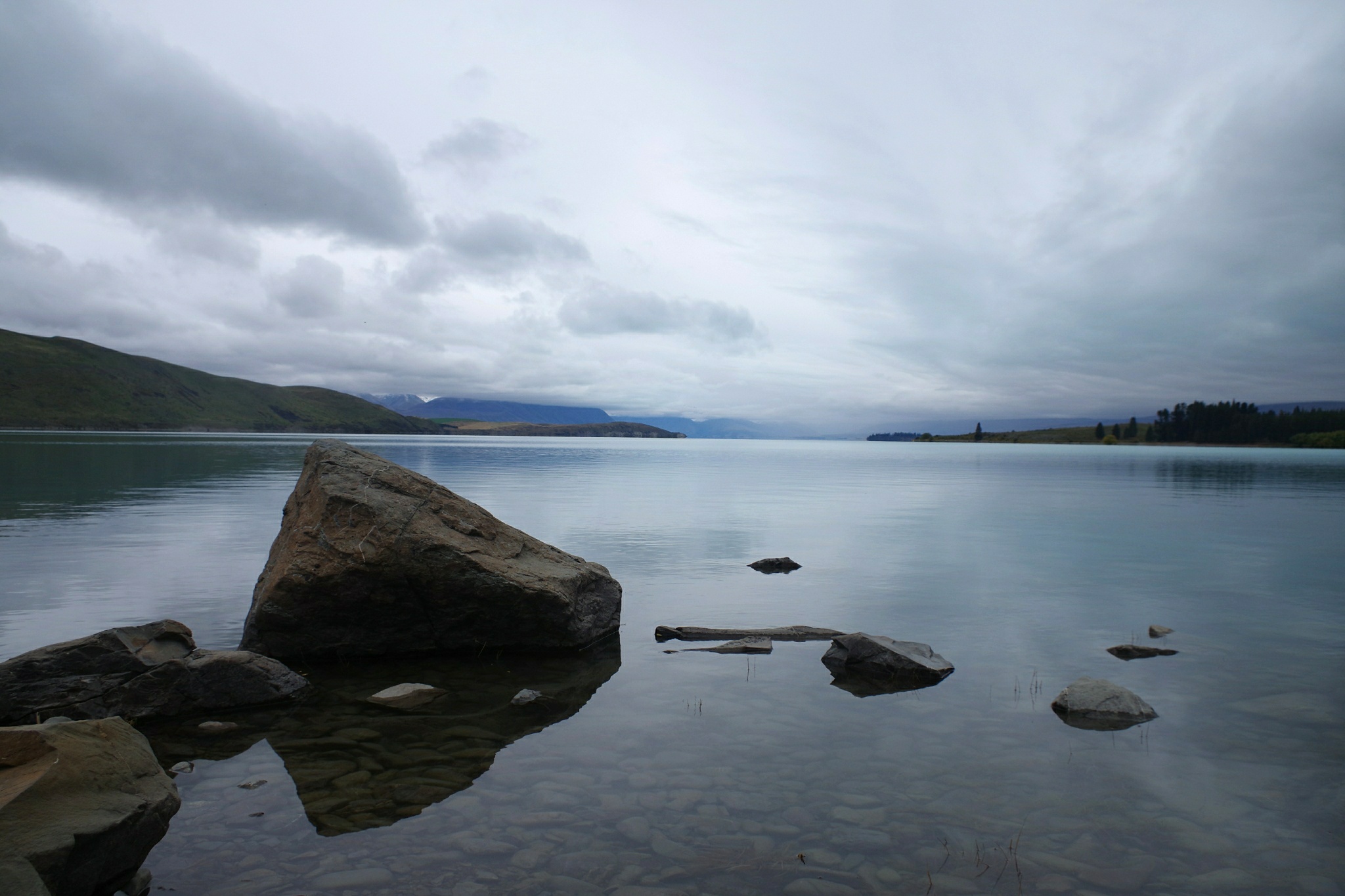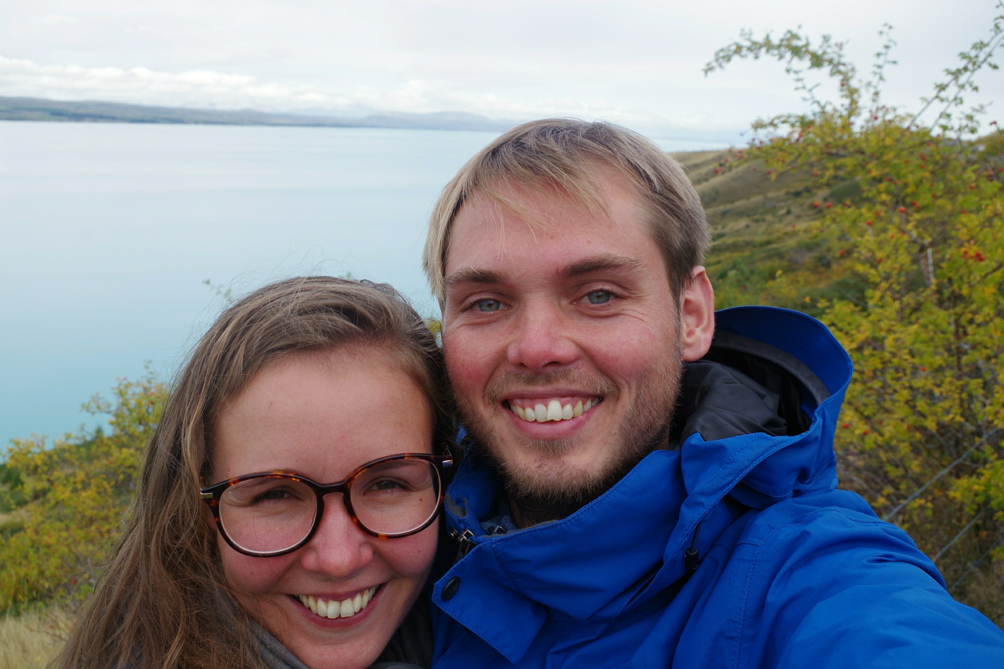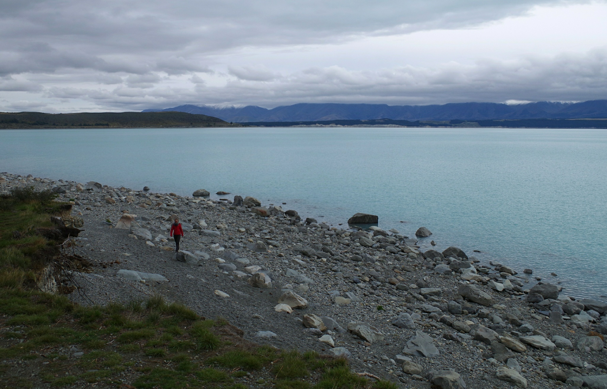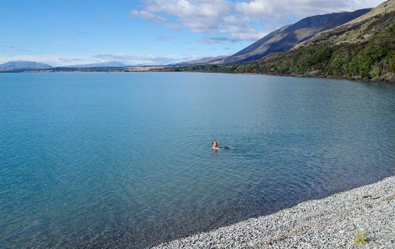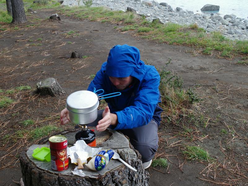 Da sind wir natürlich auch dabei, auch wenn es gerade wieder anfängt zu tröpfeln. Lange bleiben wir daher nicht und machen uns wieder auf in Richtung Mt. Cook. Dazu muss man den knapp 30 km langen Lake Pukaki einmal halb umrunden. Nachdem wir den See hinter einem Hügel das erste Mal erblicken, kommt uns ein leerer Parkplatz am See mehr als gelegen. Wir lenken Ronny direkt bis ans Seeufer und stellen erst später fest, dass das eigentlich ein Fahrradweg war. Aber was soll's, die zwei Radfahrer, die wir sehen scheint es nicht zu stören und so kochen wir in aller Ruhe direkt am Seeufer.