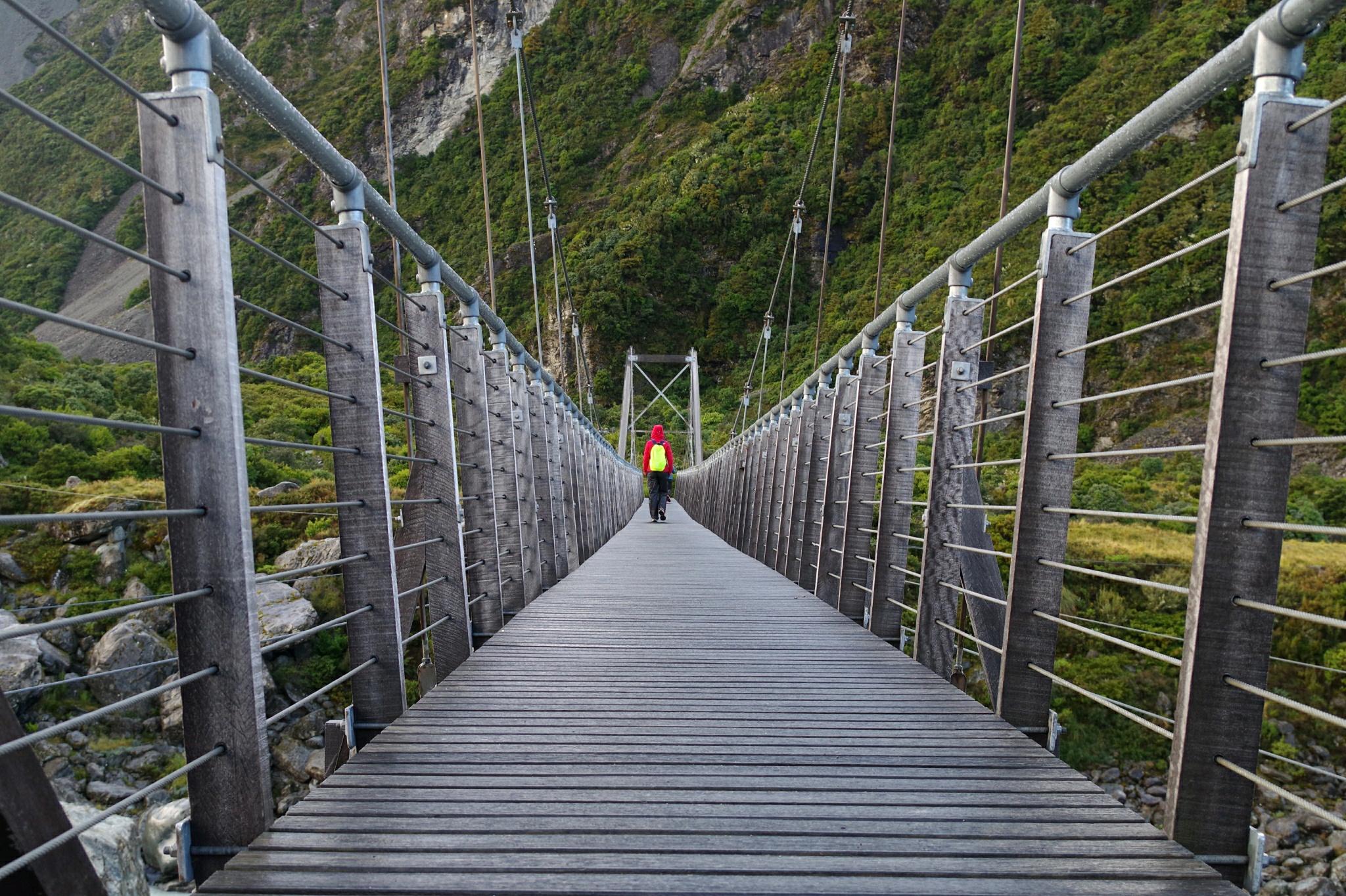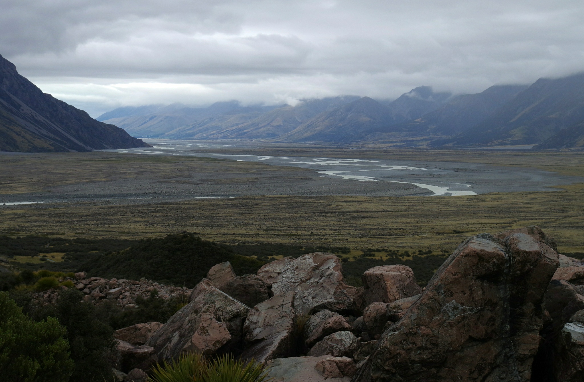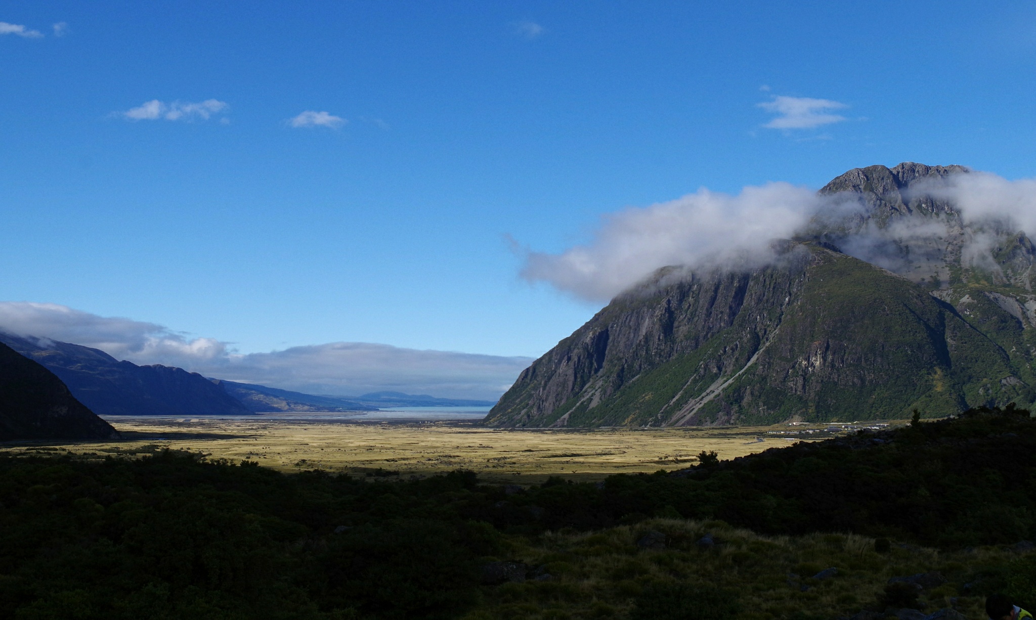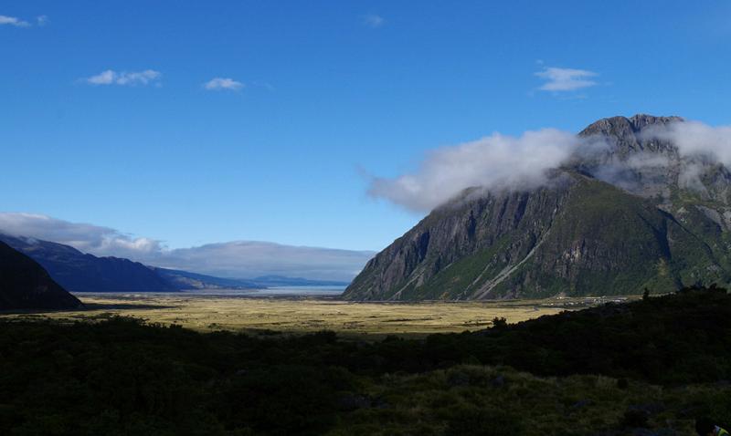 Mit Kaffee und Müsli geht es schnell besser, auch, wenn Hände und Füße nicht auftauen wollen, und wir genießen die ungetrübte und wolkenlose Aussicht auf die Umgebung. Zu warten bis das Zelt trocken ist, ist aussichtslos, also stopfen wir den nassen Haufen Zeltplane in die Hülle und zu den großen Rucksäcken in den Kofferraum. Die Tagesrucksäcke nehmen wir mit und machen uns zu Fuß auf den Weg vom Campingplatz zum nahe gelegenen Hooker Lake. Alleine sind wir dabei leider nicht, aber die Aussicht ins Tal...
