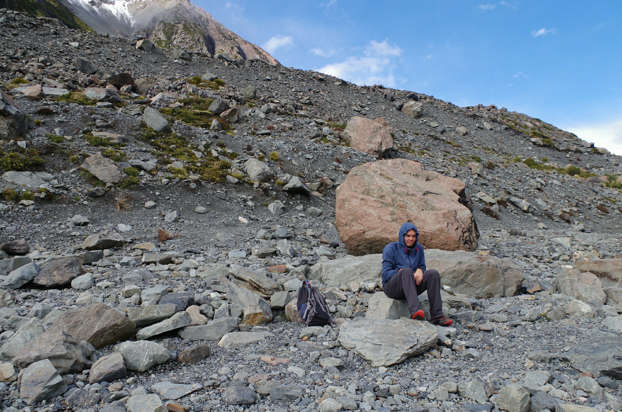 Danach entdecke ich mal wieder eine kleine gestrichelte Linie auf der Karte, die über die Moränen am Rand des Sees führt. Pia kommt mit, ist aber relativ schnell über meine dumme Idee am fluchen, da es keine Wegmarkierung gibt und wir immer wieder auf dem wenigen Moos, dass es hier gibt, herumtreten.