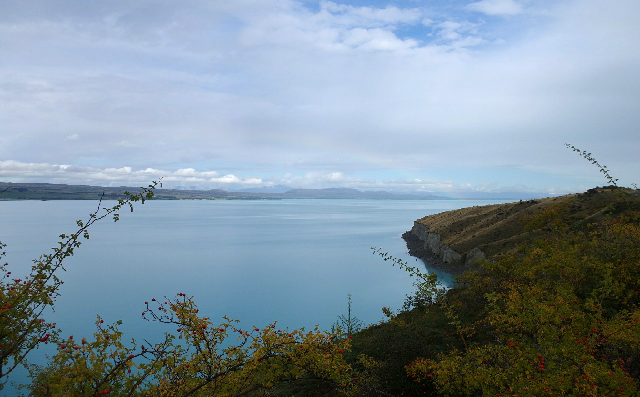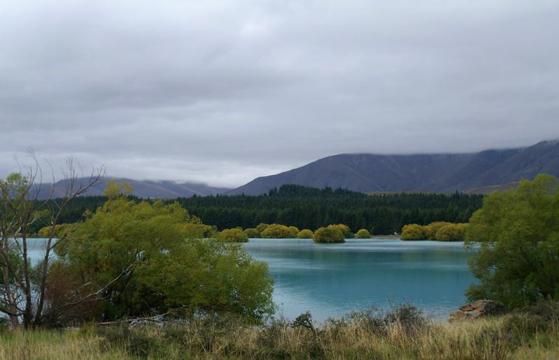Nachdem wir gespült haben, sprinten wir die paar Meter ins Auto und werden trotzdem gut nass. Gut, dass Ronny eine Heizung hat! Aber eigentlich wäre die gar nicht nötig, denn kaum sind wir aus dem Tal heraus ans Ufer des Lake Pukaki gefahren, scheint wieder die Sonne, während wir hinter uns die dicken Regenwolken beobachten.