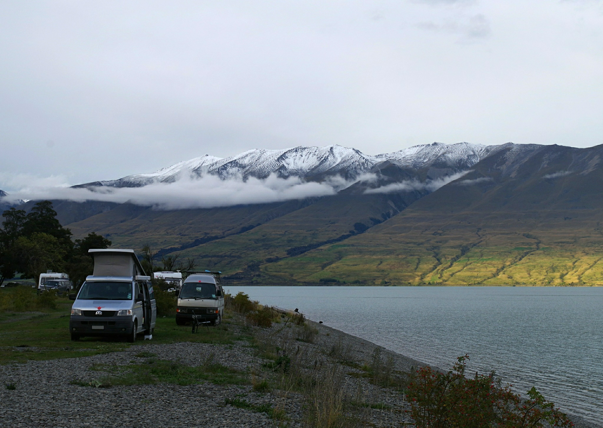 Unser Ziel für heute ist Lake Ohau, knappe 100 km entfernt. An dessen Ufer gibt es zwei DOC Campingplätze. Nach dem Besuch des ersten schauen wir uns an und entscheiden uns für den abgelegeneren und einsameren Platz, der nach einigen Kilometern Schotterpiste vor uns auftaucht.