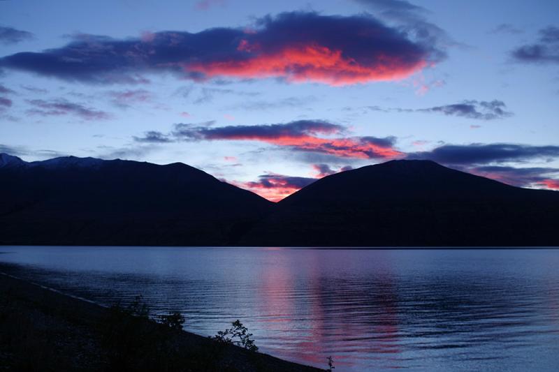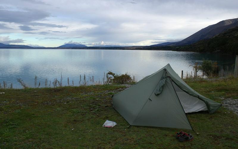 Wir entscheiden uns für letzteres und fahren Ronny zum ausgewählten Platz. Leider wird das Zeltaufstellen eine Herausforderung, denn das Seeufer besteht aus Schotter mit ein wenig Moos und Unkraut darauf. Liegt sich recht bequem, aber die Heringe wollen nur mit viel Gewühle und Nachdruck in den Boden. Dass Unmengen an Sandflies herumschwirren und jeden unbedeckten Quadratzentimeter Haut anbeißen, hilft auch nicht gerade. Aber unser Insektenspray scheint einigermaßen zu wirken. Mit dicken Steinen als Hammer bewaffnet und der Hoffnung, dass die Heringe das aushalten, ist es schließlich geschafft.