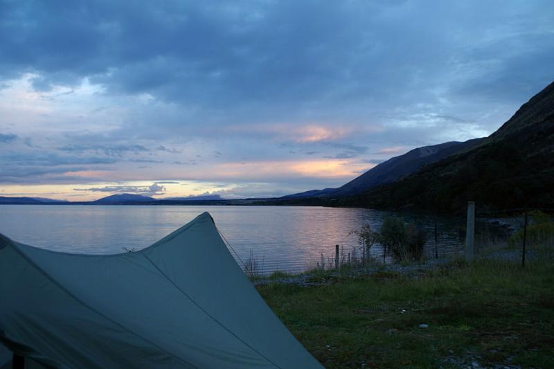 Überraschenderweise ist der Campingplatz hier hinten mittlerweile kostenlos, da das DOC aufgegeben hat hier die Gebühren zu kontrollieren, wie ich von zwei Campern erfahre, die selber für das DOC arbeiten. Wir erkunden den Platz und überlegen, wo wir unser Zelt aufstellen wollen. Strategisch klug unter ein paar Bäumen und nahe zum Plumpsklo oder am Ende des Platzes direkt am Seeufer mit freiem Blick.