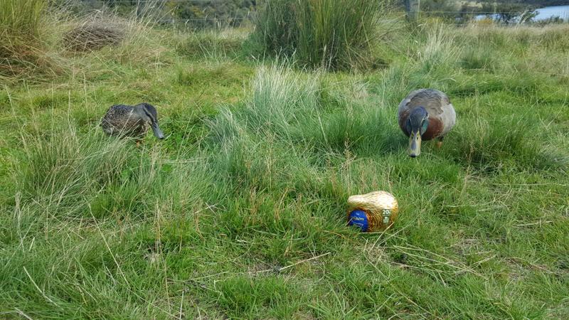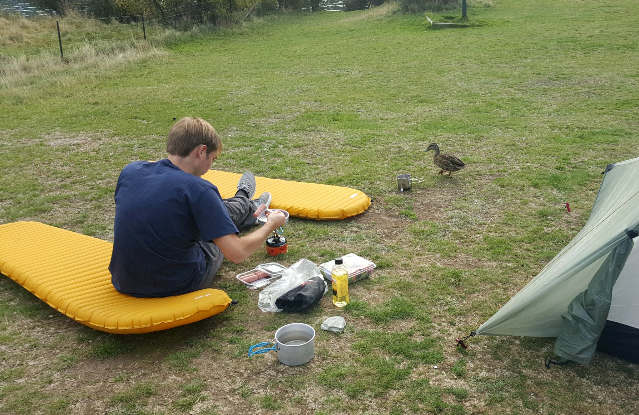 Während des Essens schleichen teilweise bis zu fünf Enten um unser Zelt und gucken, ob es irgendwo etwas abzustauben gibt. Bei unseren Nachbarn im Camper nebenan sind sie dann erfolgreich, da die beiden versuchen die Enten von sich fern zu halten, indem sie sie mit Brot weglocken. Das Ganze bewirkt natürlich eher das Gegenteil. Wir haben so auf jeden Fall Unterhaltung, auch wenn ich zwischendurch bestimmt eine halbe Stunde eher weniger erfolgreich versuche mit kaltem Wasser das Fett aus der Pfanne zu spülen. Demnächst gibt es nur noch Nudeln!