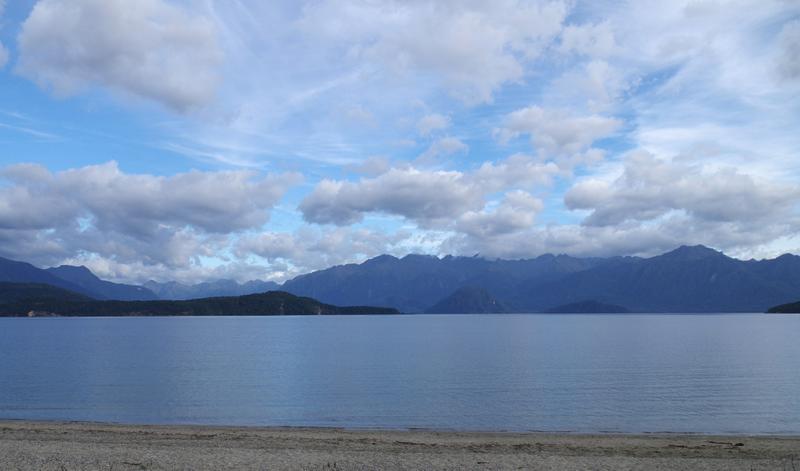 Die letzten 100 km zu unserem Campingplatz in der Nähe des Trails führen uns mitten in die Sounds. Die Straße schlängelt sich zunächst mal durch Wiesen, mal durch Wald entlang des riesigen Lake Te Anau.