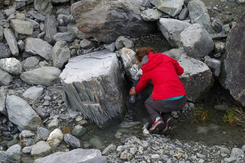 Irgendwann finden wir doch eine Stelle hinter ein paar Büschen weit ab vom Trail und unser grünes Zelt findet man sowieso nicht so schnell. Wie immer: Bei Sonnenuntergang aufbauen und bei Sonnenaufgang wieder verschwinden ohne Spuren zu hinterlassen - Passt schon. Es bleibt sogar noch Zeit für ein sehr kurzes und sehr kaltes Bad an einer einsamen Stelle im Gletscherfluss, bevor wir frisch gebadet all unsere Lagen anziehen und in unsere Schlafsäcke kriechen. Heute Nacht hält das Zelt hoffentlich, immerhin hatten wir unsere Panne für heute schon!