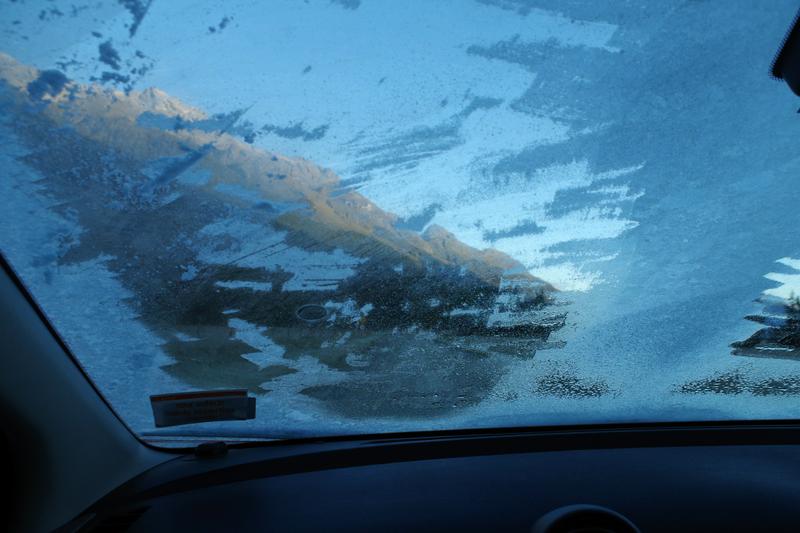 Auch am Auto erkennen wir, wie kalt es war, denn auf den Scheiben liegt eine dicke Eisschicht. Einen Kratzer gibt es natürlich keinen, also muss die Tube Sonnencreme falsch herum als Eiskratzer herhalten. Wir werden dabei aufmerksam aus dem Wohnwagen nebenan beäugt, wo gerade der Kaffee aufgetischt wird, während die Standheizung leise vor sich hin summt. Wir beachten unsere Nachbarn aber nicht weiter und gucken, dass wir hier weg kommen.