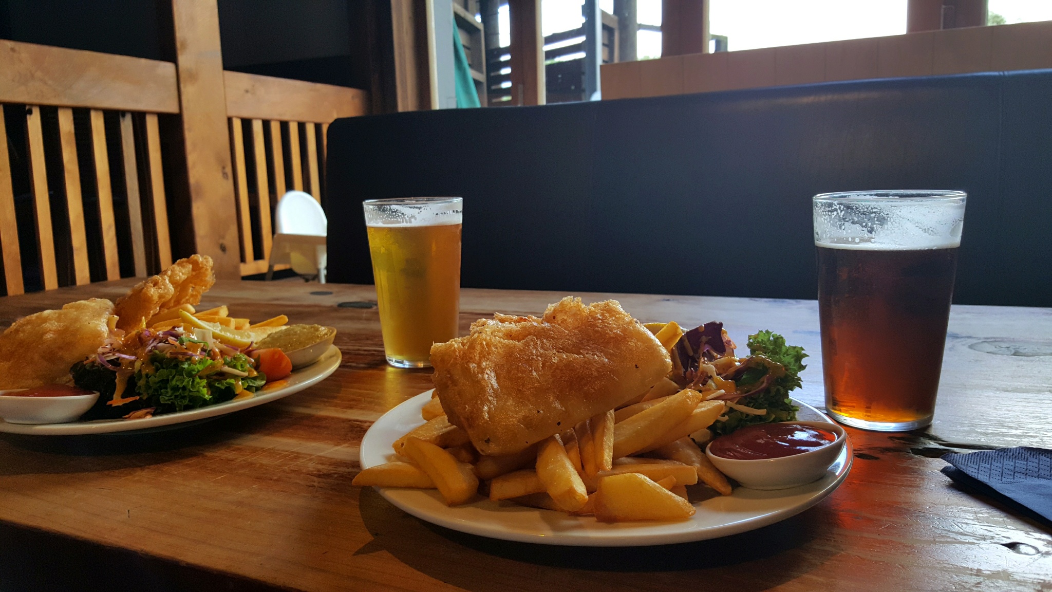 In einer Regenpause verlassen wir unser Hostel und suchen uns etwas zum Abendessen. Als wir nach zehn Minuten im "Zentrum" sind (sofern man bei den drei Cafés und zwei Bars von Zentrum sprechen kann), fängt es wieder an zu schütten. Wir entscheiden uns gegen die Fish and Chips am Imbiss und für luxuriösere Fish and Chips im Whaler's Pub nebenan.