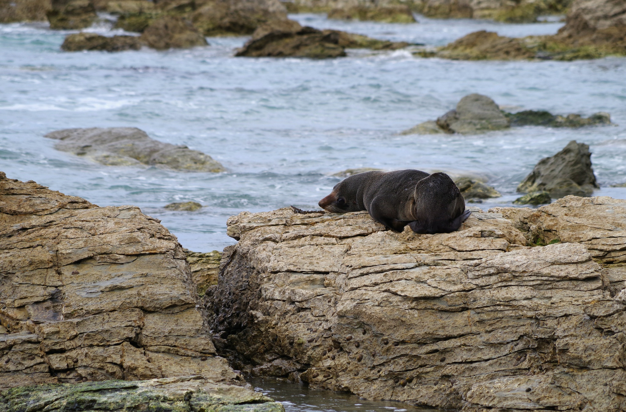 Bei Ebbe spazieren wir über den felsigen Strand, bis wir einen kleinen Pfad entlang der Küste erreichen. Hier leben einige Robbenkolonien, die es sich hier überall gemütlich gemacht haben..