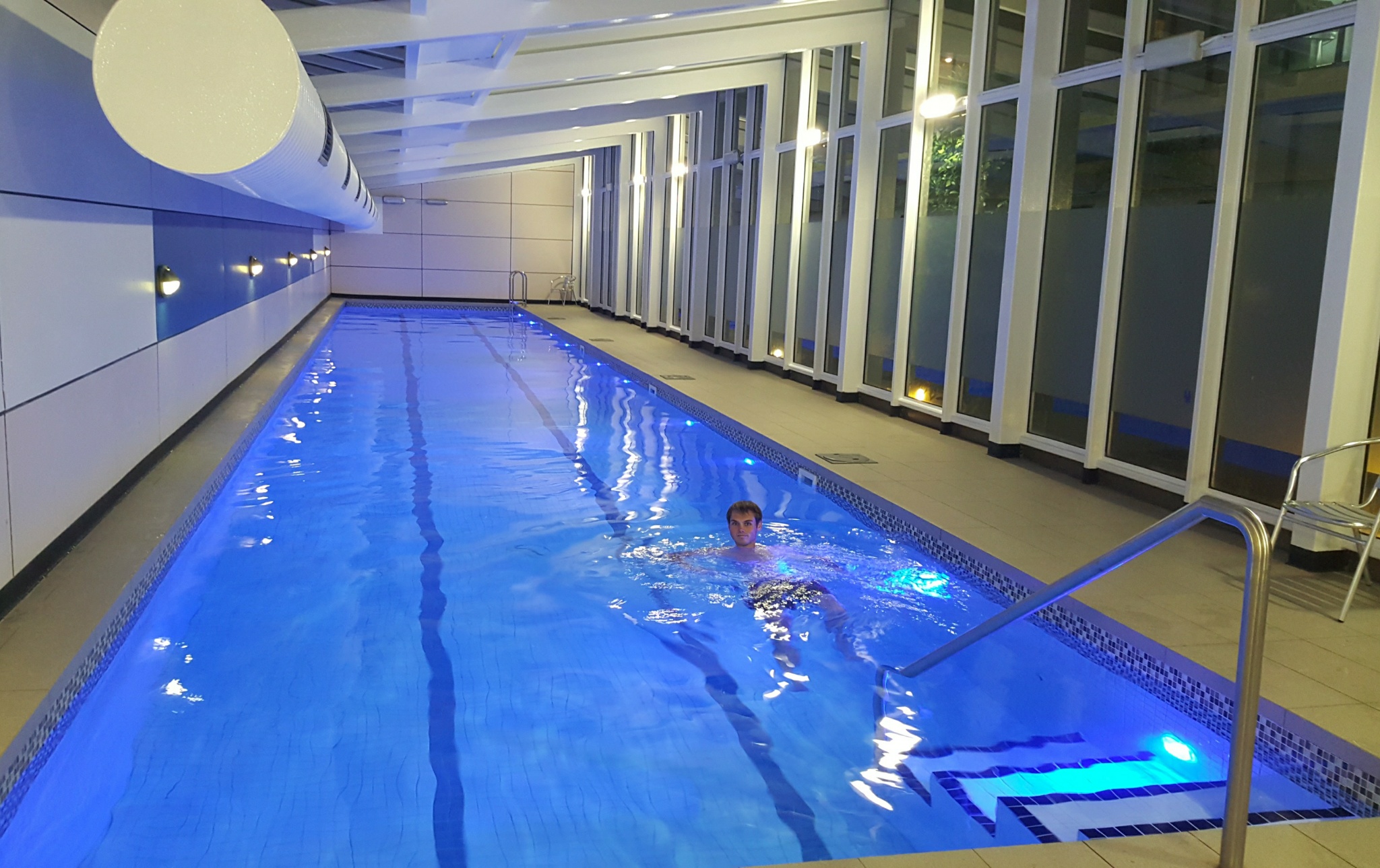 Aber da wir ja eine Luxuswohnung haben, ist im Wohnkomplex selbstverständlich neben Grillplatz, Fitnessraum und Tennisplatz auch ein eigener Pool vorhanden,...