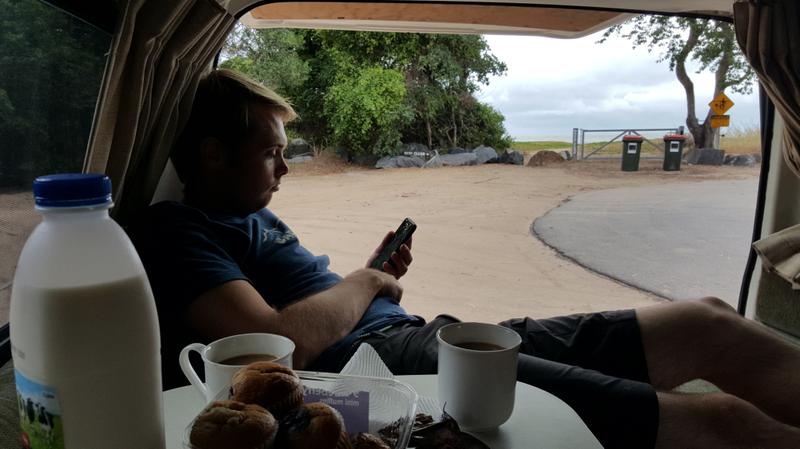 Die Kaffeepause am Strand war trotz Nieselregen schonmal sehr gemütlich.